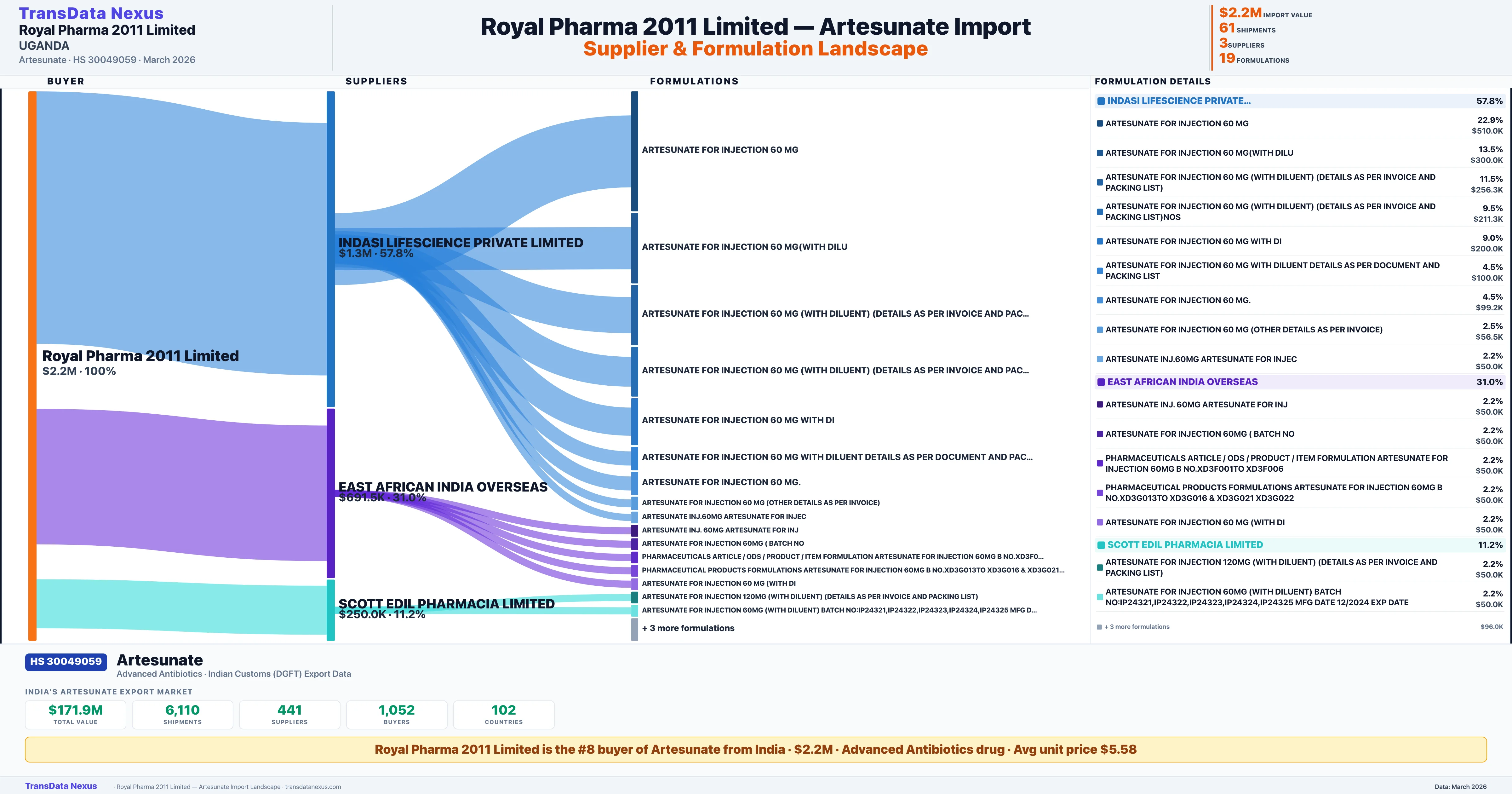 ROYAL PHARMA 2011 LIMITED sources Artesunate from 3 verified Indian suppliers: INDASI LIFESCIENCE PRIVATE LIMITED ($1.3M, 57.8%), EAST AFRICAN INDIA OVERSEAS ($691.5K, 31.0%), SCOTT EDIL PHARMACIA LIMITED ($250.0K, 11.2%). This is based on 61 customs records.