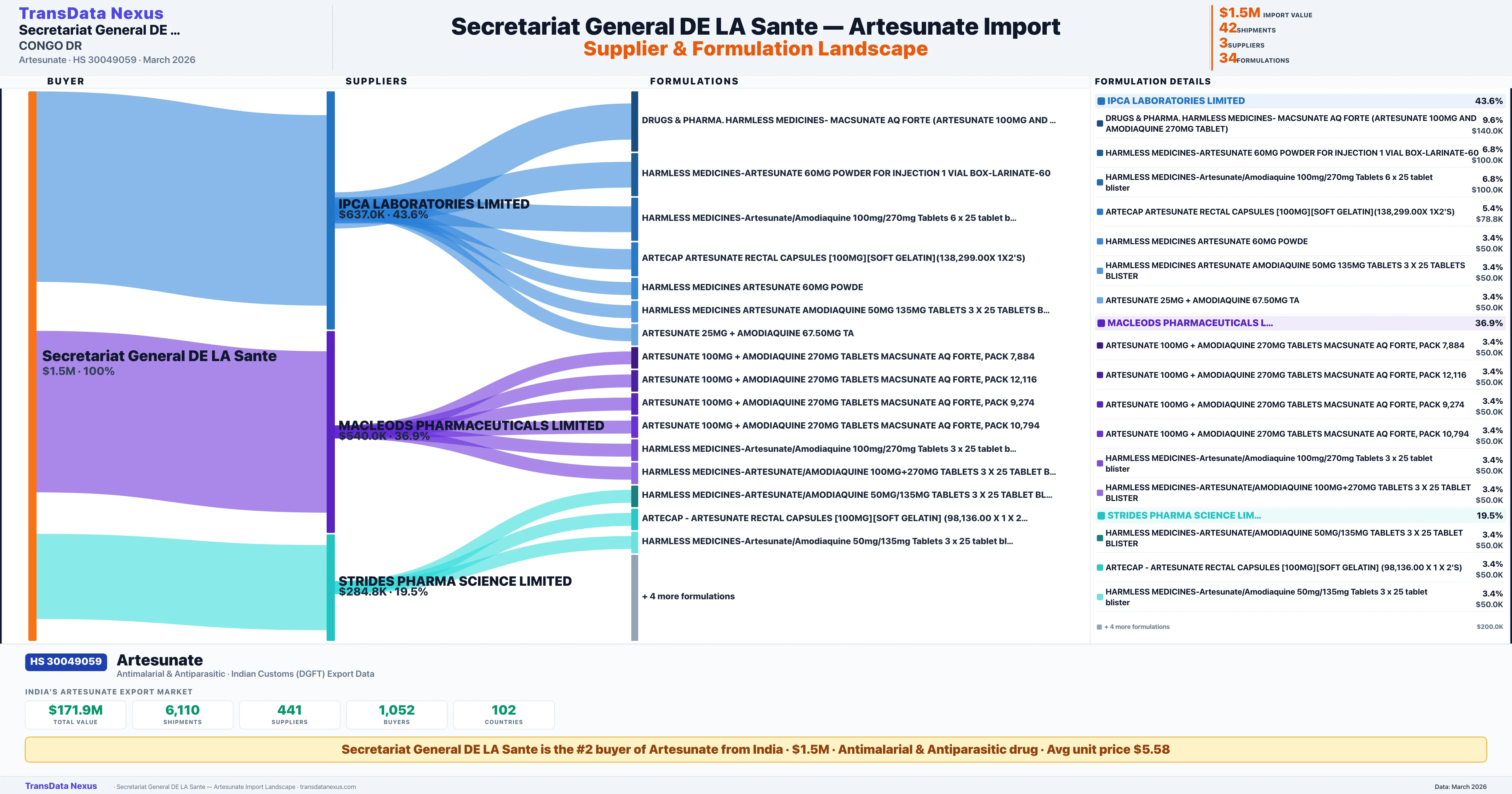 Pharmaceutical Importer Β· #2 buyer for Artesunate Β· $1.5M import value Β· 42 shipments Β· CONGO, THE DEMOCRATIC REPUBLIC OF THE Β· DGFT Verified