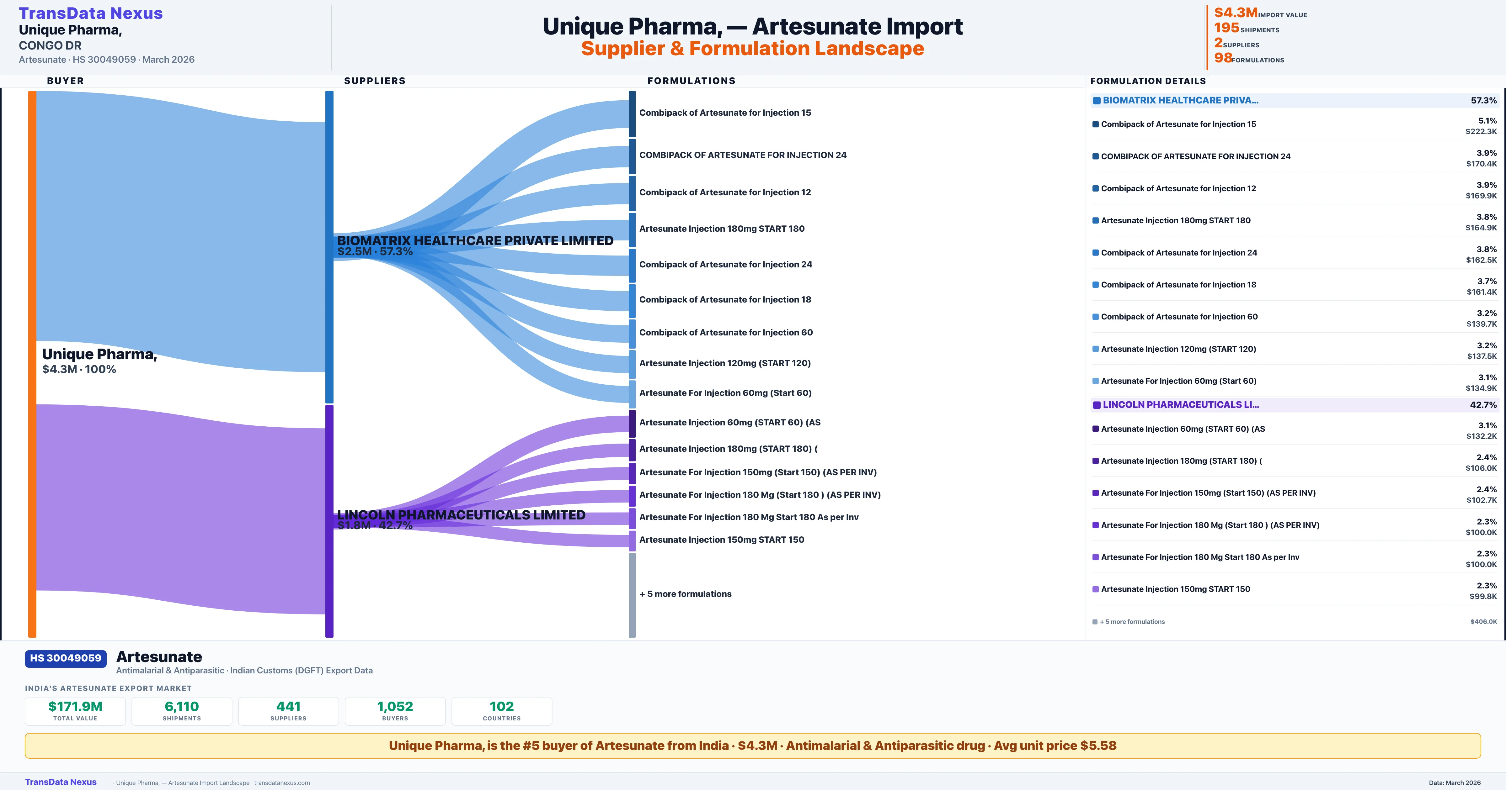 UNIQUE PHARMA sources Artesunate from 2 verified Indian suppliers: BIOMATRIX HEALTHCARE PRIVATE LIMITED ($2.5M, 57.3%), LINCOLN PHARMACEUTICALS LIMITED ($1.8M, 42.7%). This is based on 195 customs records.