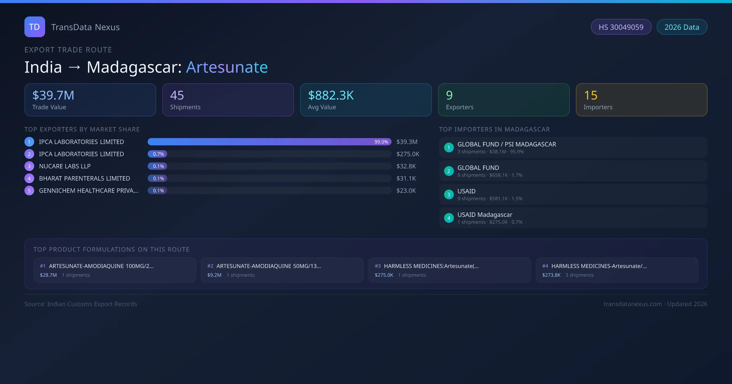 India has recorded 45 verified shipments of Artesunate exported to Madagascar, representing a combined trade value of $39.7M USD. This corridor is served by 9 active Indian exporters, with an average shipment value of $882.3K USD. The leading Indian exporter is IPCA LABORATORIES LIMITED, which accounts for 99% of total export value with 20 shipments worth $39.3M USD. On the buying side, GLOBAL FUND / PSI MADAGASCAR is the largest importer in Madagascar with $38.1M USD in purchases. The top 3 suppliers — IPCA LABORATORIES LIMITED, IPCA LABORATORIES LIMITED , NUCARE LABS LLP — together control 100% of total trade value on this route. All data sourced from Indian Customs (DGFT) shipping bill records. Values reported in FOB USD.