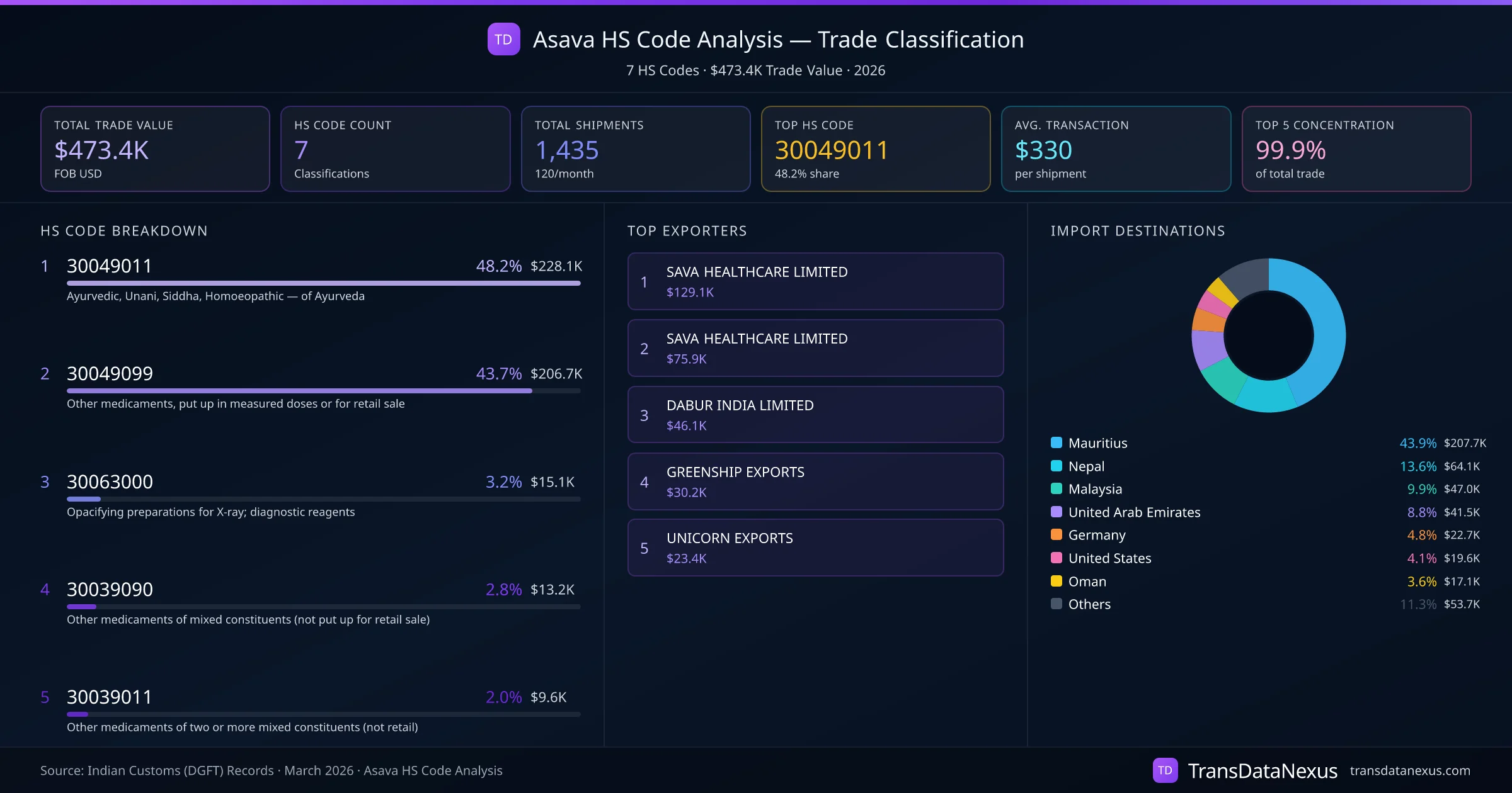 India exports Asava under 7 distinct HS code classifications, representing a total trade value of $473.4K across 1,435 shipments. The dominant classification is HS 30049011 (Ayurvedic, Unani, Siddha, Homoeopathic โ of Ayurveda), accounting for 48.2% of all Asava trade at $228.1K. HS 30049099 (Other medicaments, put up in measured doses or for retail sale) follows at 43.7% ($206.7K). The top 5 HS codes together account for 99.9% of total Asava trade from India. The average transaction value is $330. Key importing markets include Mauritius, Nepal, Malaysia. Leading exporters include SAVA HEALTHCARE LIMITED and SAVA HEALTHCARE LIMITED . Data sourced from Indian Customs (DGFT) shipping bill records.