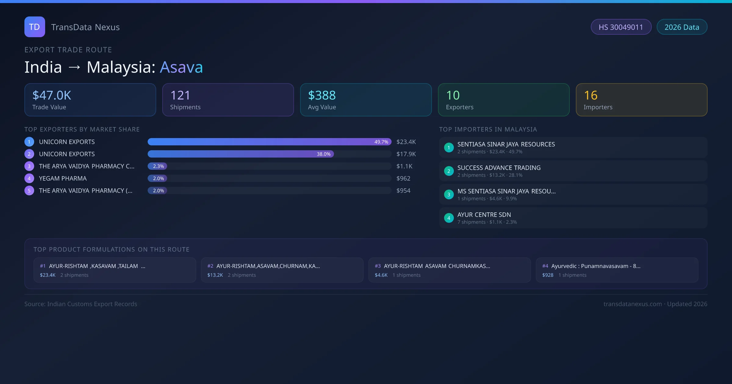The India to Malaysia Asava corridor is one of India's established pharmaceutical export routes, with 121 shipments documented worth a combined $47.0K USD. The route is dominated by UNICORN EXPORTS , which alone accounts for roughly 50% of all export value, reflecting the consolidated nature of India's asava manufacturing sector.
