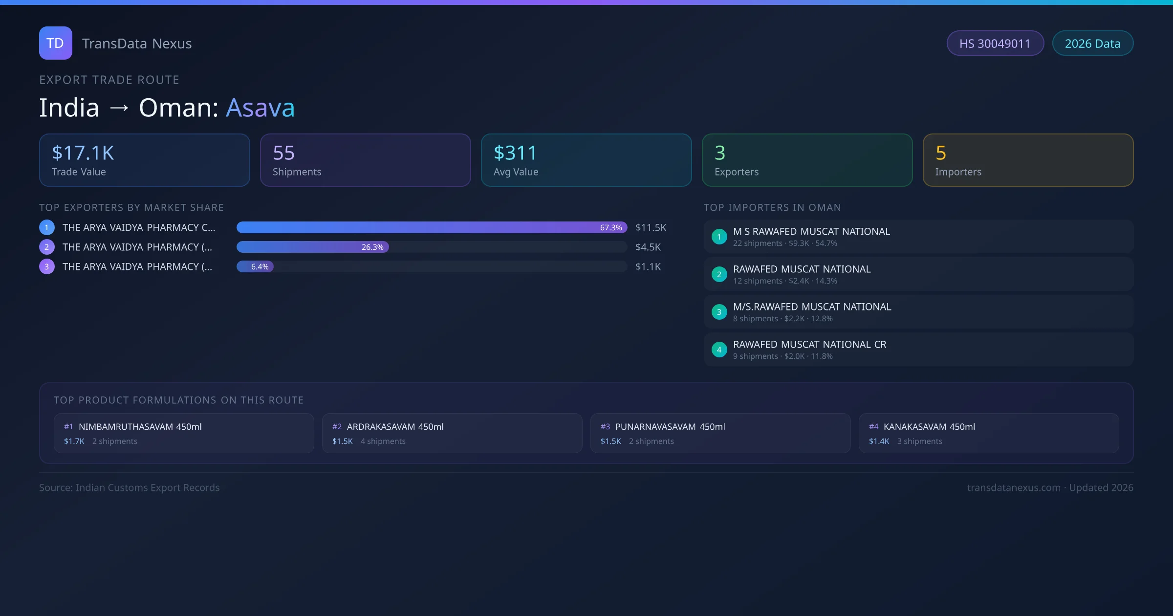 The leading Indian exporters of Asava to Oman are THE ARYA VAIDYA PHARMACY COIMBATORE LIMITED, THE ARYA VAIDYA PHARMACY (COIMBATORE) LIMITED, THE ARYA VAIDYA PHARMACY (COIMBATORE) LIMITED . THE ARYA VAIDYA PHARMACY COIMBATORE LIMITED holds the largest market share at approximately 67% of total trade value on this route.