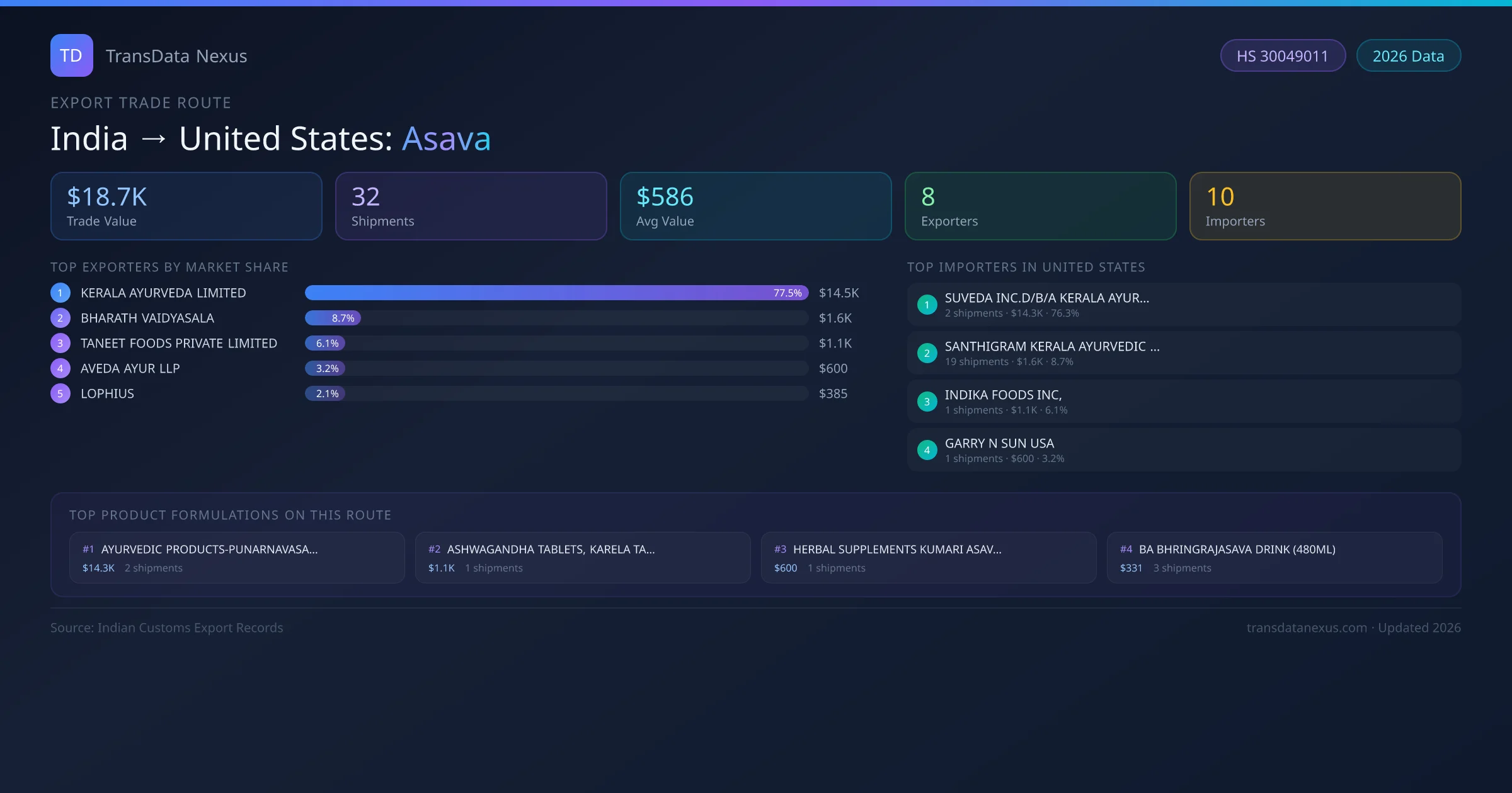 India has recorded 32 verified shipments of Asava exported to United States, representing a combined trade value of $18.7K USD. This corridor is served by 8 active Indian exporters, with an average shipment value of $586 USD. The leading Indian exporter is KERALA AYURVEDA LIMITED, which accounts for 78% of total export value with 3 shipments worth $14.5K USD. On the buying side, SUVEDA INC.D/B/A KERALA AYURVEDA is the largest importer in United States with $14.3K USD in purchases. The top 3 suppliers — KERALA AYURVEDA LIMITED, BHARATH VAIDYASALA, TANEET FOODS PRIVATE LIMITED — together control 92% of total trade value on this route. All data sourced from Indian Customs (DGFT) shipping bill records. Values reported in FOB USD.
