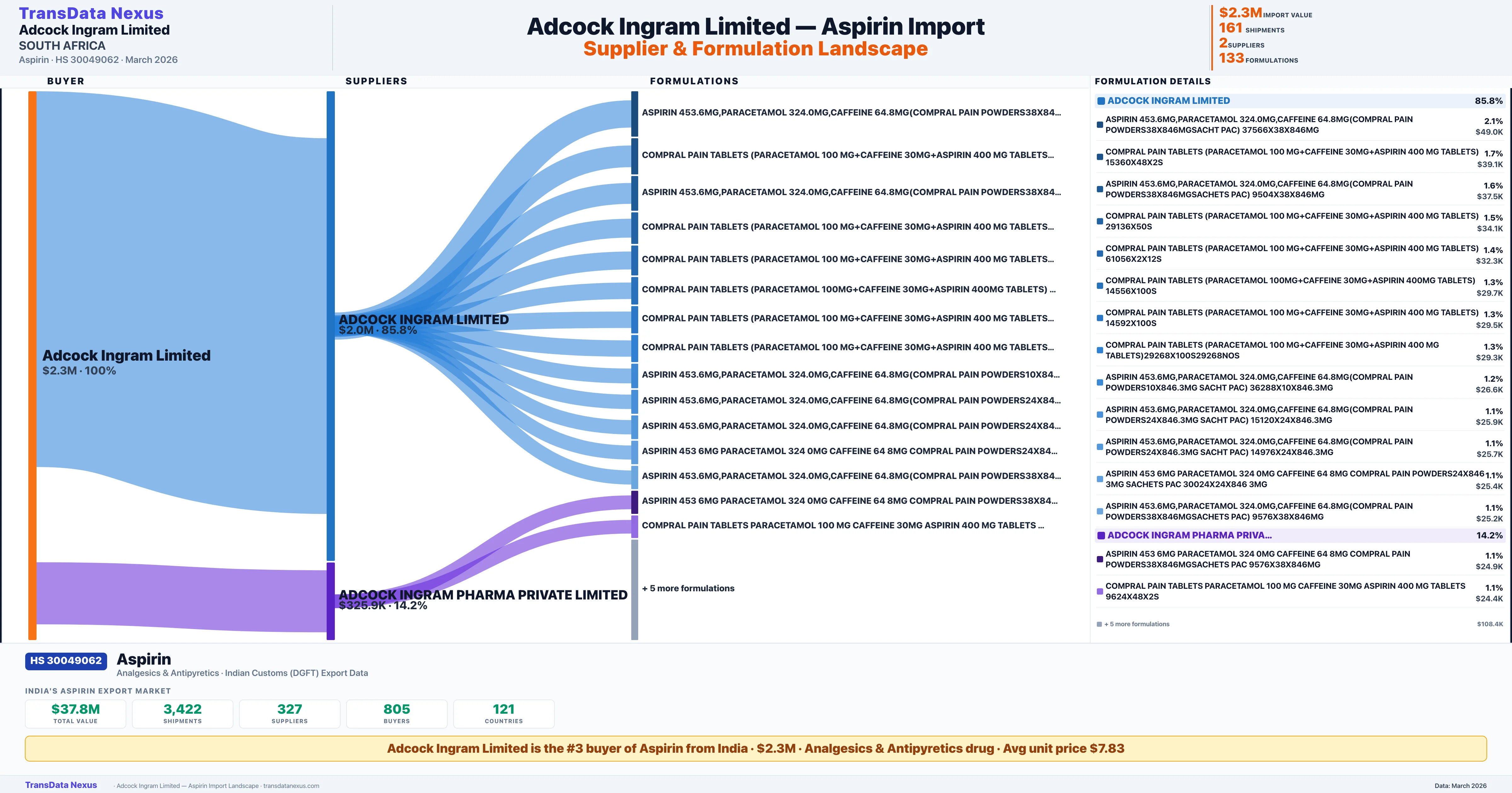 ADCOCK INGRAM LIMITED imports 133 distinct Aspirin formulations from India. The top formulation is ASPIRIN 453.6MG,PARACETAMOL 324.0MG,CAFFEINE 64.8MG(COMPRAL with 1 shipments worth $49.0K.