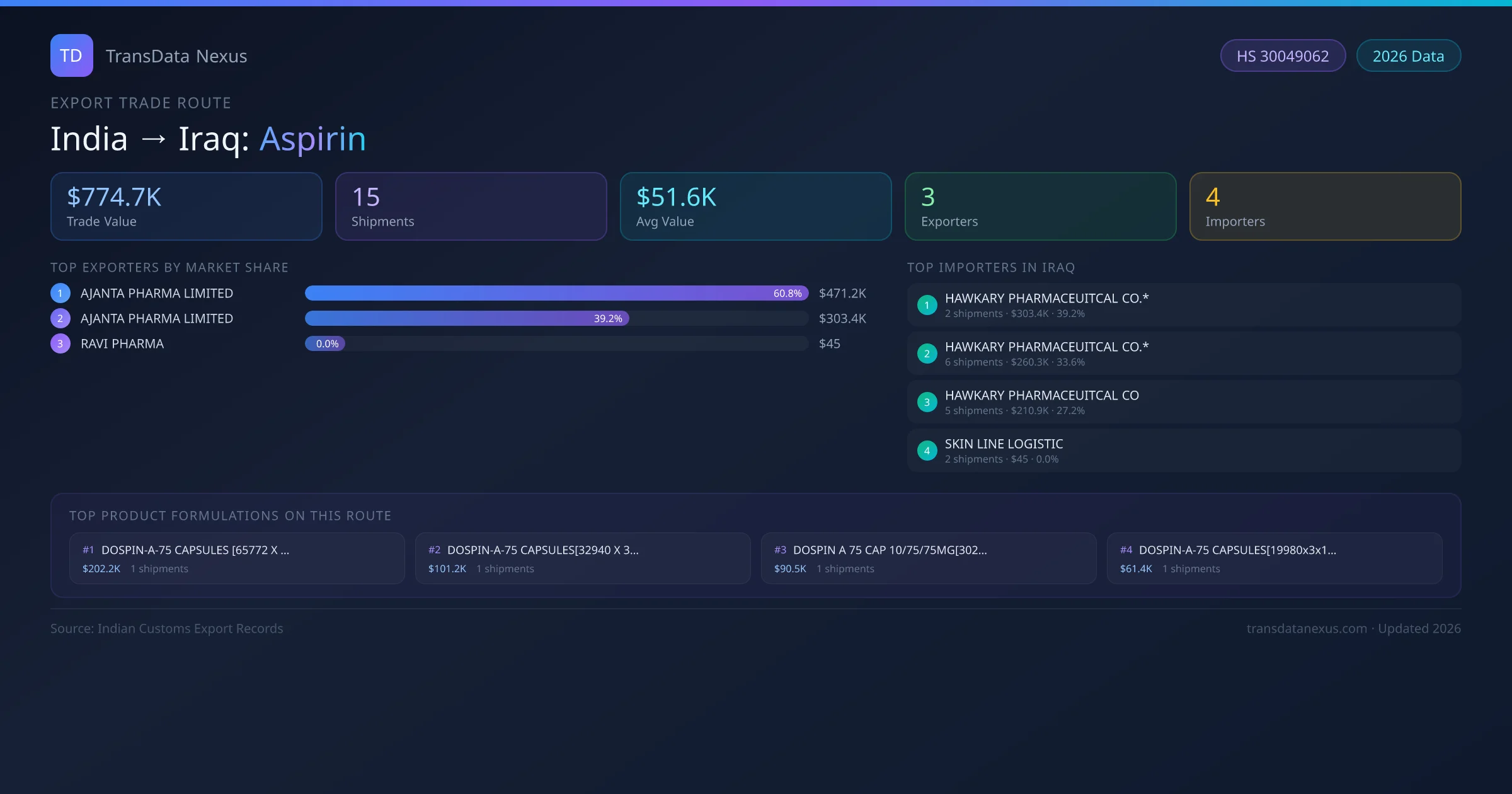 India has recorded 15 verified shipments of Aspirin exported to Iraq, representing a combined trade value of $774.7K USD. This corridor is served by 3 active Indian exporters, with an average shipment value of $51.6K USD. The leading Indian exporter is AJANTA PHARMA LIMITED, which accounts for 61% of total export value with 11 shipments worth $471.2K USD. On the buying side, HAWKARY PHARMACEUITCAL CO.* is the largest importer in Iraq with $303.4K USD in purchases. The top 3 suppliers — AJANTA PHARMA LIMITED, AJANTA PHARMA LIMITED , RAVI PHARMA — together control 100% of total trade value on this route. All data sourced from Indian Customs (DGFT) shipping bill records. Values reported in FOB USD.