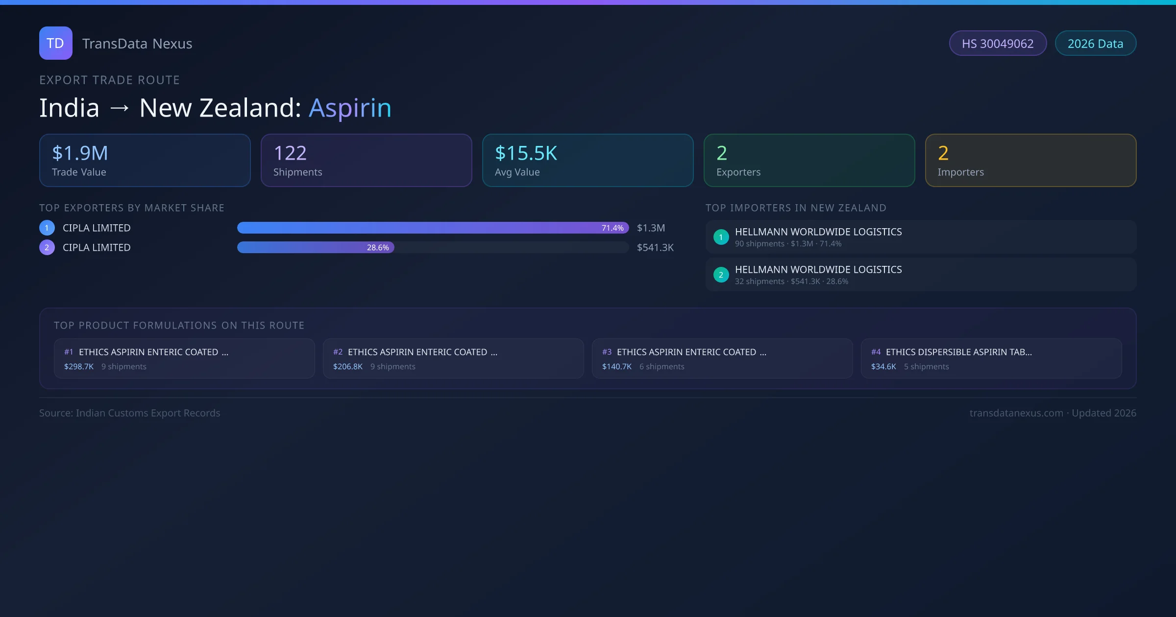 - 1.Route Identification: India to New Zealand export trade corridor identified from Indian Customs (DGFT) records for Aspirin.