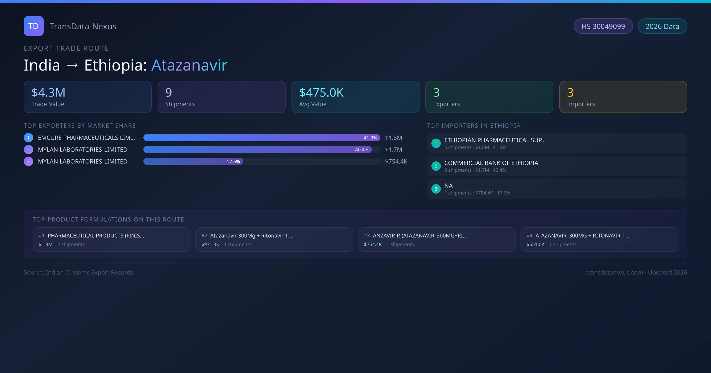 India has recorded 9 verified shipments of Atazanavir exported to Ethiopia, representing a combined trade value of $4.3M USD. This corridor is served by 3 active Indian exporters, with an average shipment value of $475.0K USD. The leading Indian exporter is EMCURE PHARMACEUTICALS LIMITED, which accounts for 42% of total export value with 5 shipments worth $1.8M USD. On the buying side, ETHIOPIAN PHARMACEUTICAL SUPPLY SER is the largest importer in Ethiopia with $1.8M USD in purchases. The top 3 suppliers — EMCURE PHARMACEUTICALS LIMITED, MYLAN LABORATORIES LIMITED, MYLAN LABORATORIES LIMITED — together control 100% of total trade value on this route. All data sourced from Indian Customs (DGFT) shipping bill records. Values reported in FOB USD.