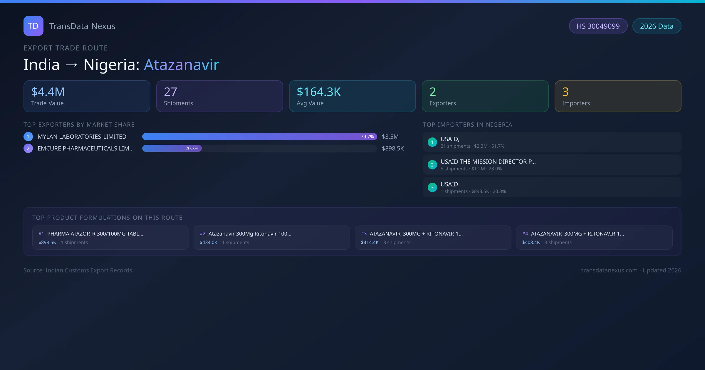 - 1.Route Identification: India to Nigeria export trade corridor identified from Indian Customs (DGFT) records for Atazanavir.