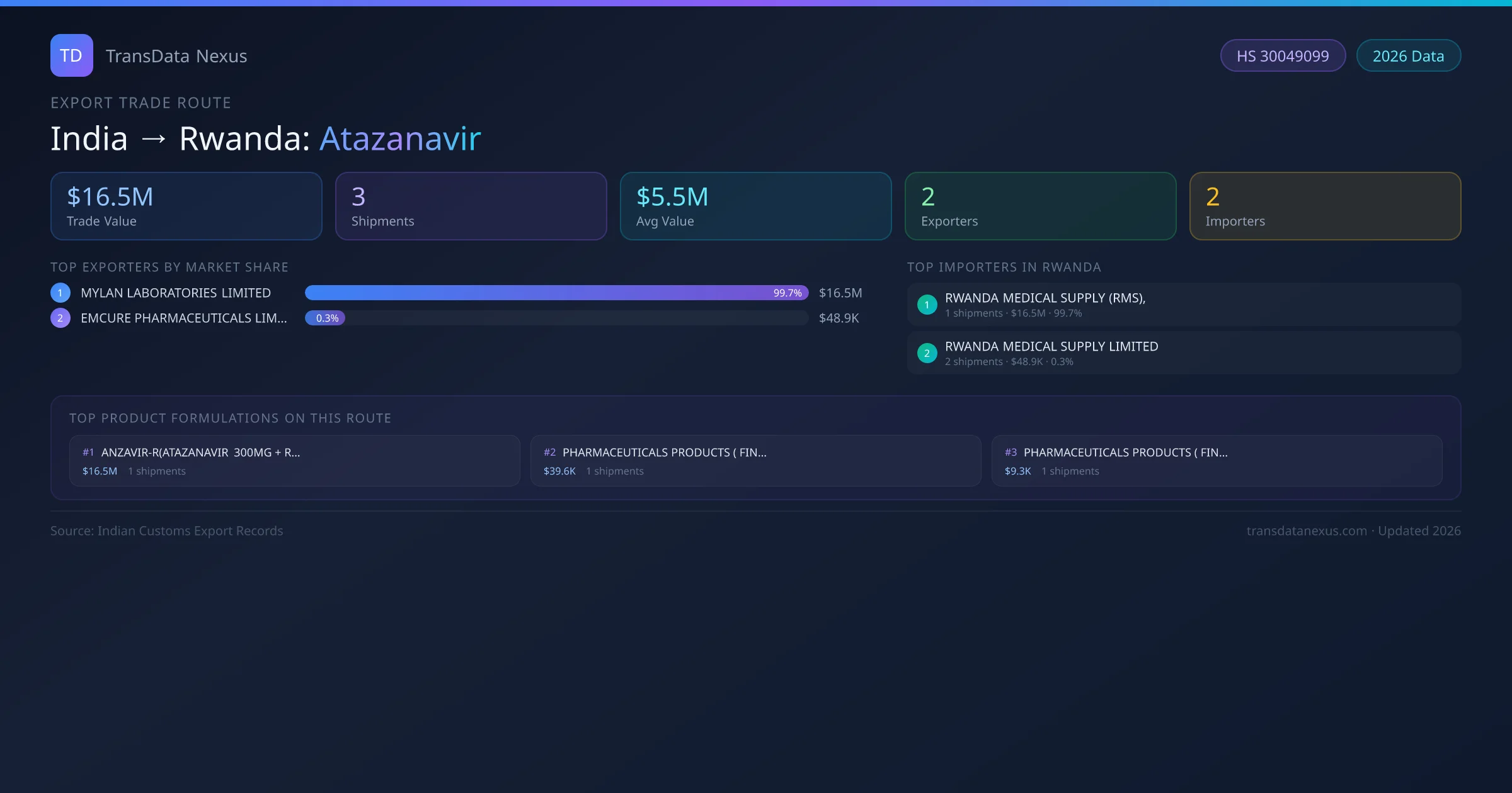 - 1.Route Identification: India to Rwanda export trade corridor identified from Indian Customs (DGFT) records for Atazanavir.