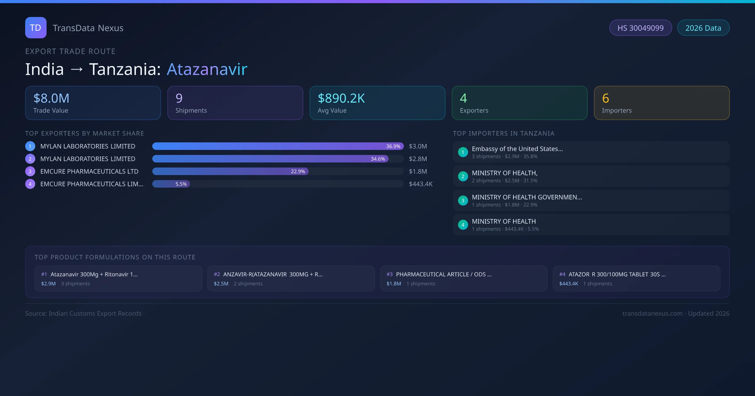 India exports Atazanavir to Tanzania worth approximately $8.0M USD across 9 recorded shipments. The average value per shipment is $890.2K USD.