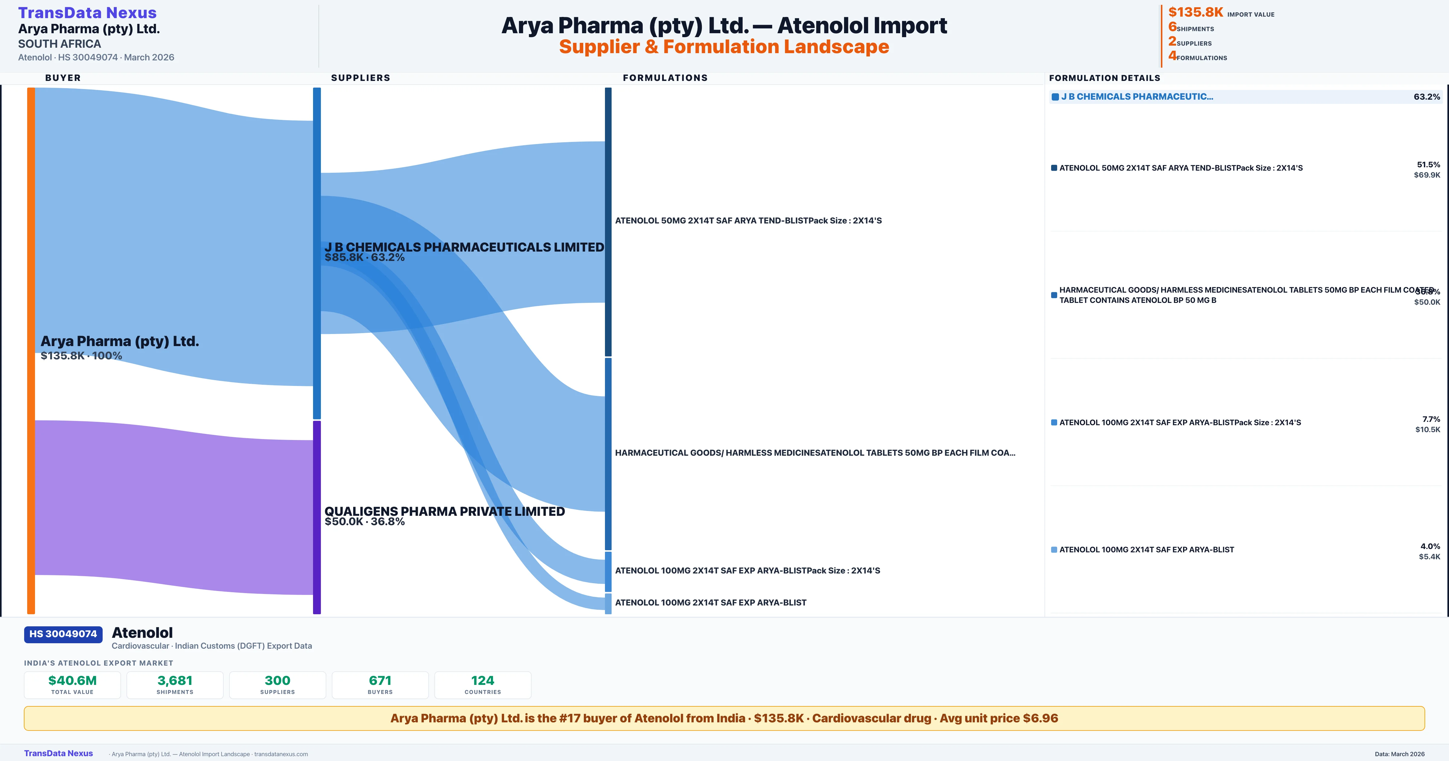 ARYA PHARMA (PTY) LTD. sources Atenolol from 2 verified Indian suppliers: J B CHEMICALS PHARMACEUTICALS LIMITED ($85.8K, 63.2%), QUALIGENS PHARMA PRIVATE LIMITED ($50.0K, 36.8%). This is based on 6 customs records.
