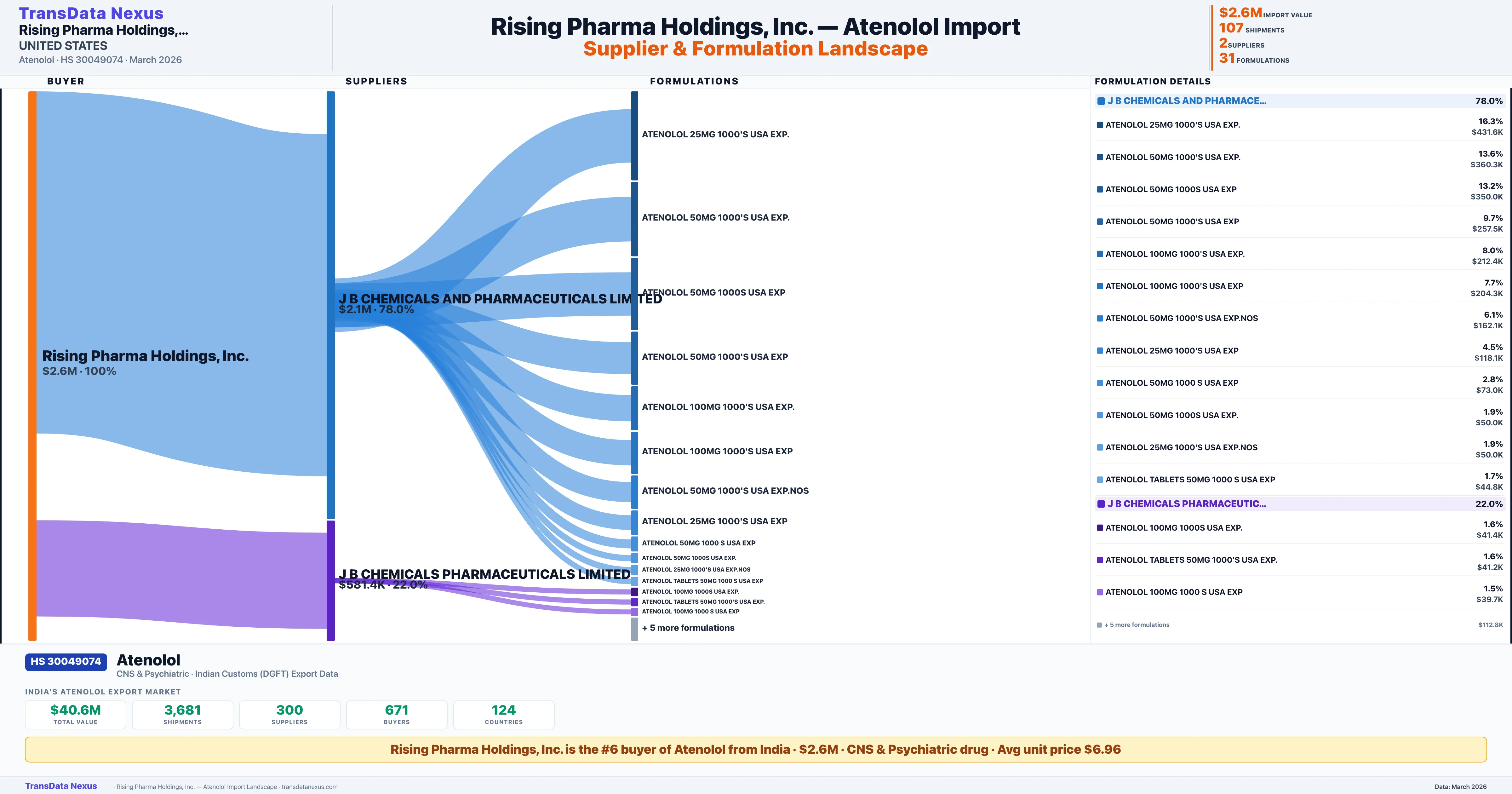 RISING PHARMA HOLDINGS INC sources Atenolol from 2 verified Indian suppliers based on 107 customs records. The primary supplier is J B CHEMICALS AND PHARMACEUTICALS LIMITED accounting for 78.0% of imports.