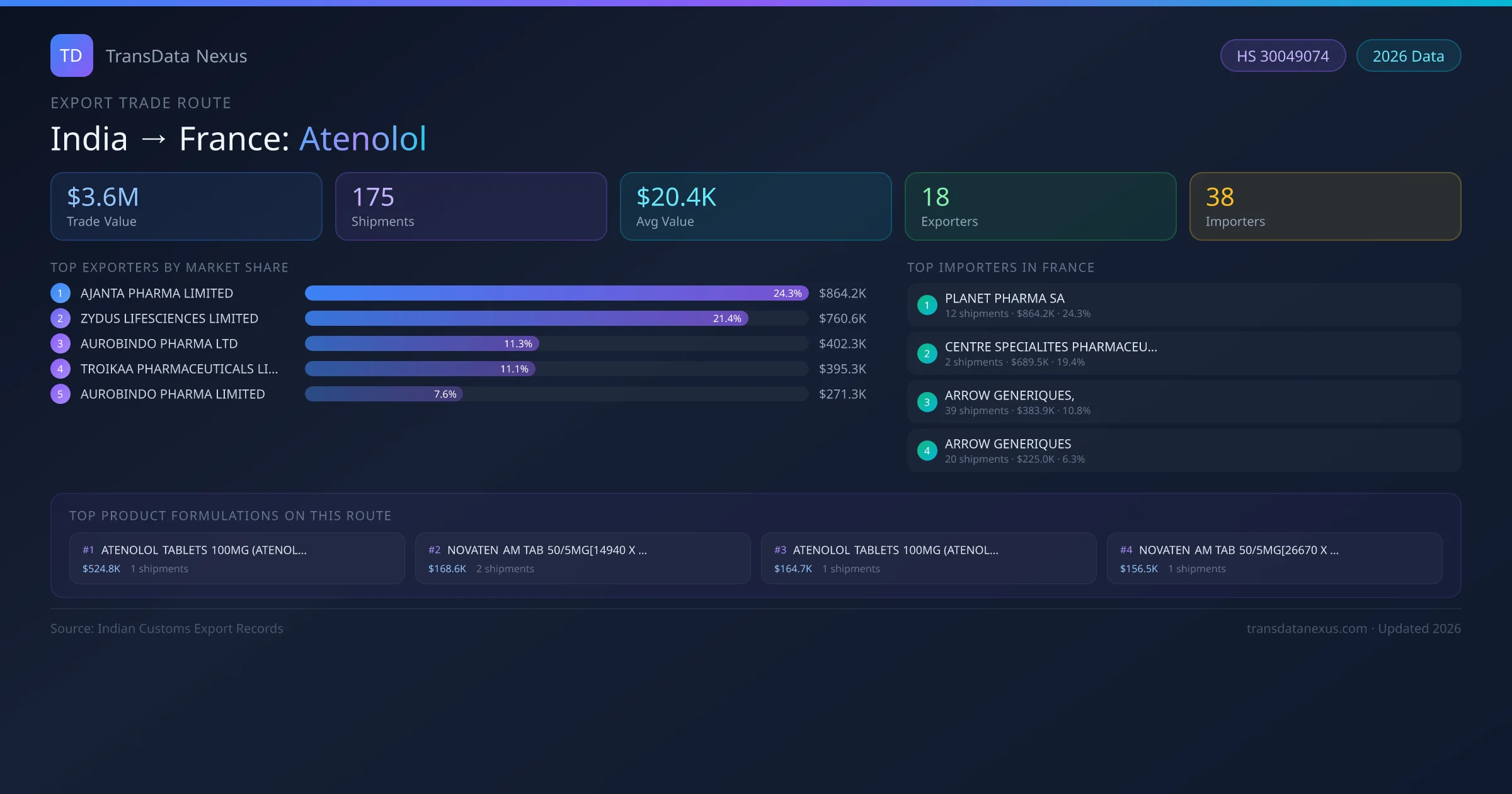 India has recorded 175 verified shipments of Atenolol exported to France, representing a combined trade value of $3.6M USD. This corridor is served by 18 active Indian exporters, with an average shipment value of $20.4K USD. The leading Indian exporter is AJANTA PHARMA LIMITED, which accounts for 24% of total export value with 12 shipments worth $864.2K USD. On the buying side, PLANET PHARMA SA is the largest importer in France with $864.2K USD in purchases. The top 3 suppliers — AJANTA PHARMA LIMITED, ZYDUS LIFESCIENCES LIMITED, AUROBINDO PHARMA LTD — together control 57% of total trade value on this route. All data sourced from Indian Customs (DGFT) shipping bill records. Values reported in FOB USD.