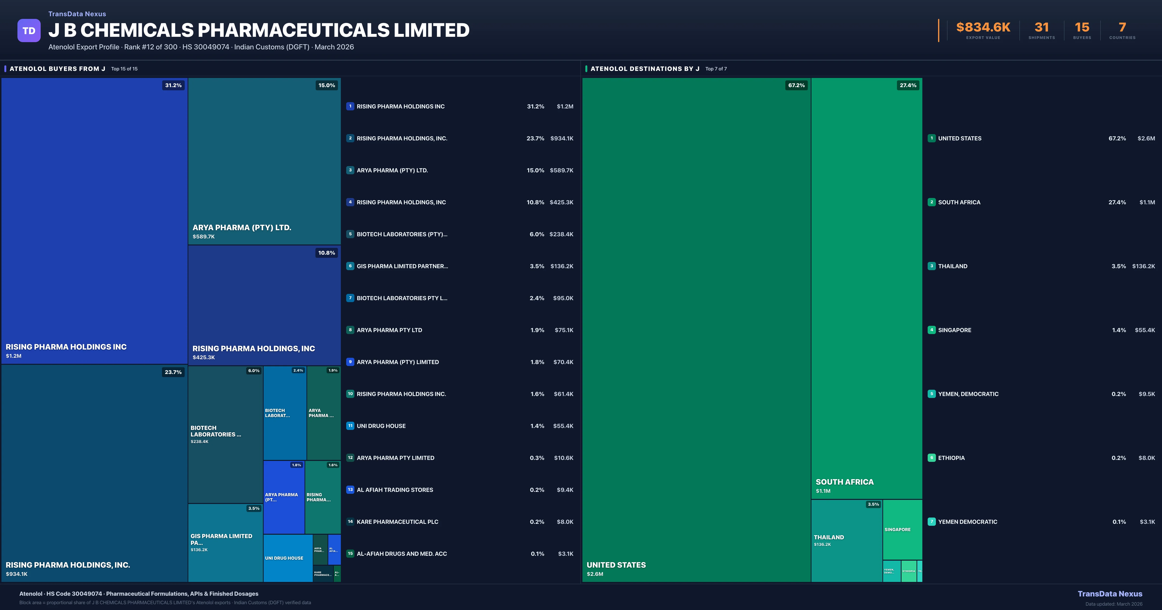 J B Chemicals Pharmaceuticals Limited supplies Atenolol to 15 buyers globally. The largest buyer is RISING PHARMA HOLDINGS INC (UNITED STATES), followed by RISING PHARMA HOLDINGS, INC. (UNITED STATES) and ARYA PHARMA (PTY) LTD. (SOUTH AFRICA). These buyers represent pharmaceutical distributors, hospital groups, and government procurement agencies in their respective markets.