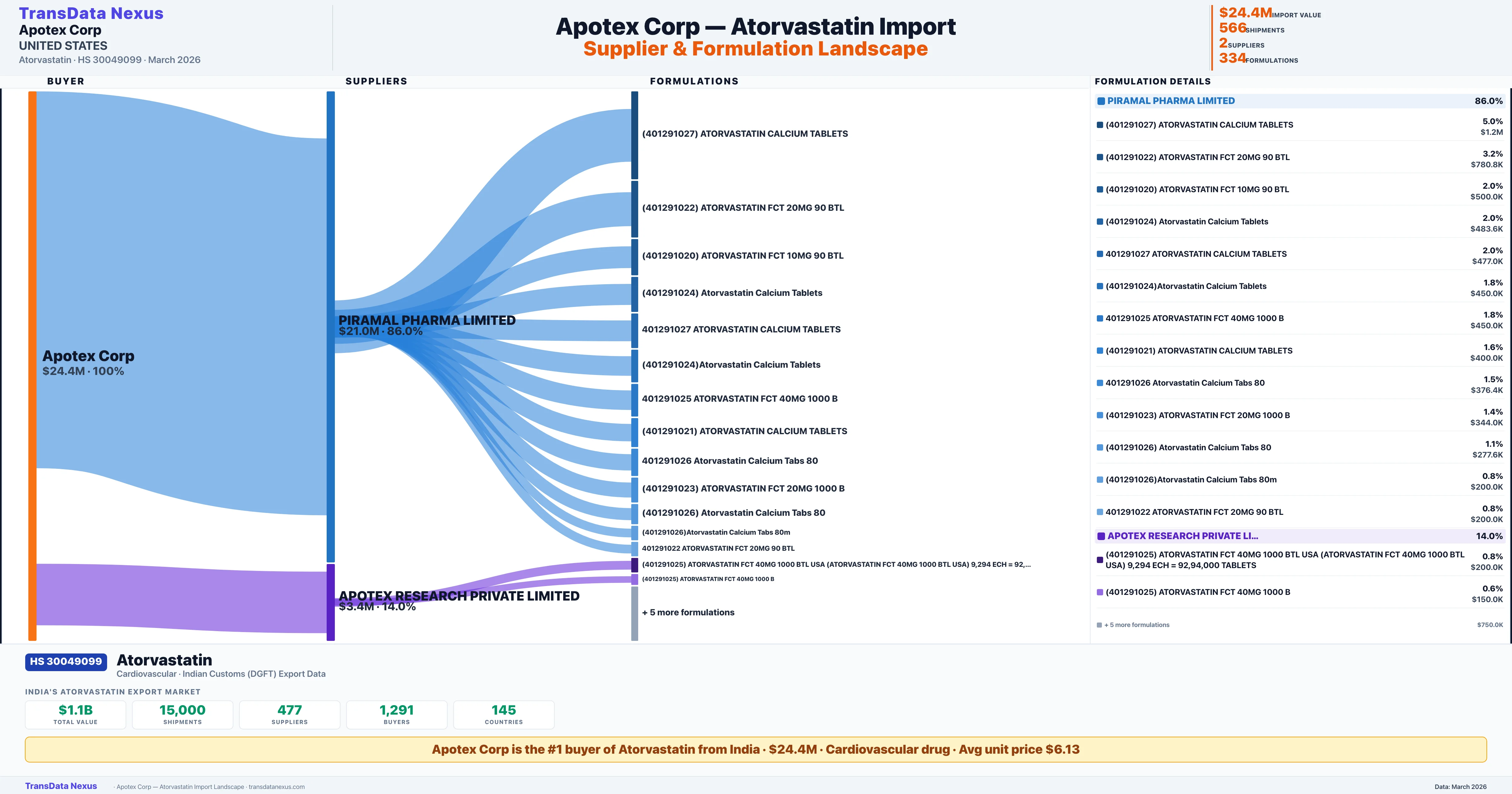 APOTEX CORP imports 334 distinct Atorvastatin formulations from India. The top formulation is (401291027) ATORVASTATIN CALCIUM TABLETS with 26 shipments worth $1.2M.