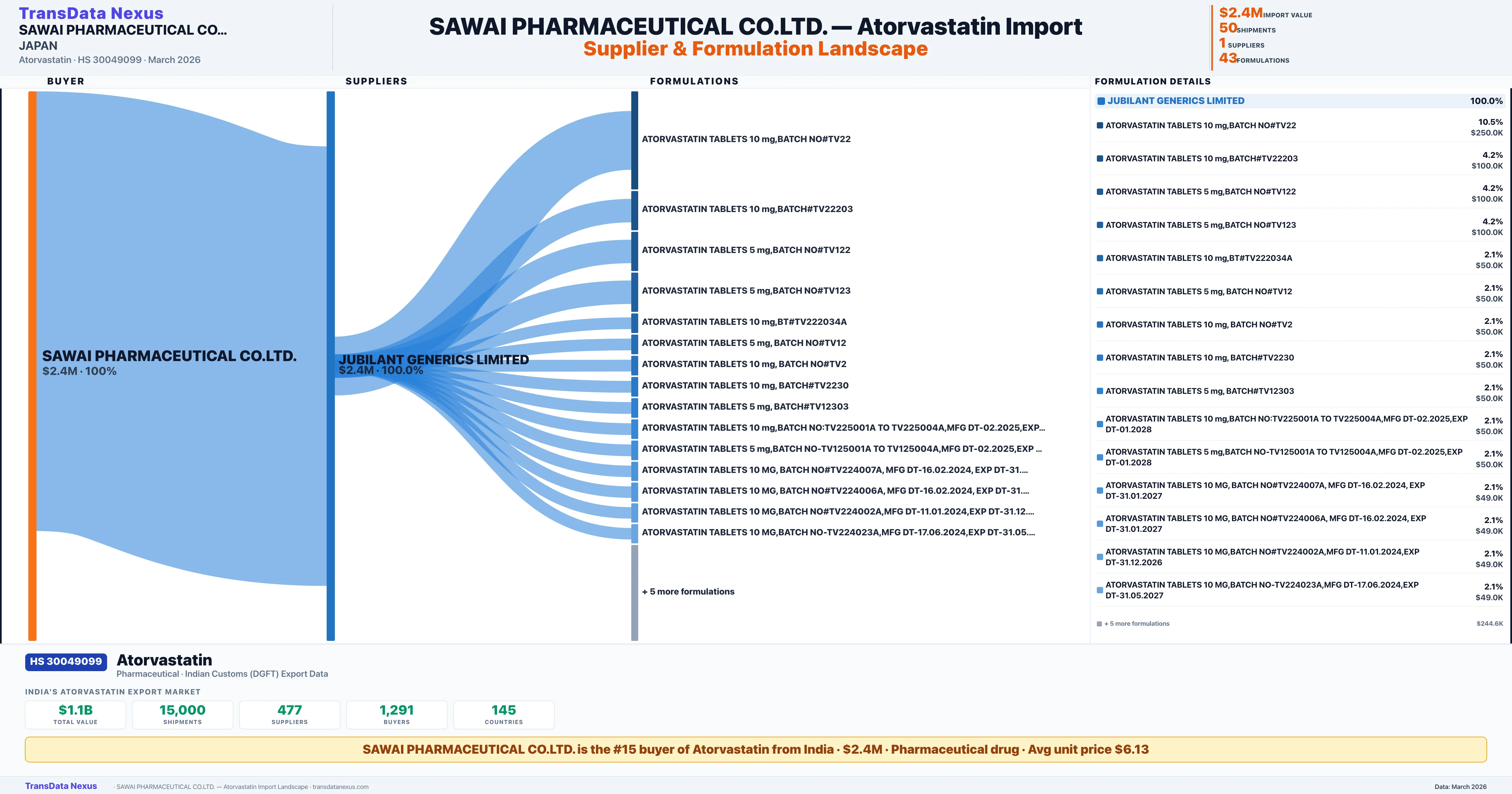 Access order-level details, pricing data, supplier connections, and competitive analysis for SAWAI PHARMACEUTICAL CO.LTD.'s Atorvastatin imports. TransData Nexus provides verified Indian Customs (DGFT) data trusted by pharmaceutical trade professionals worldwide.