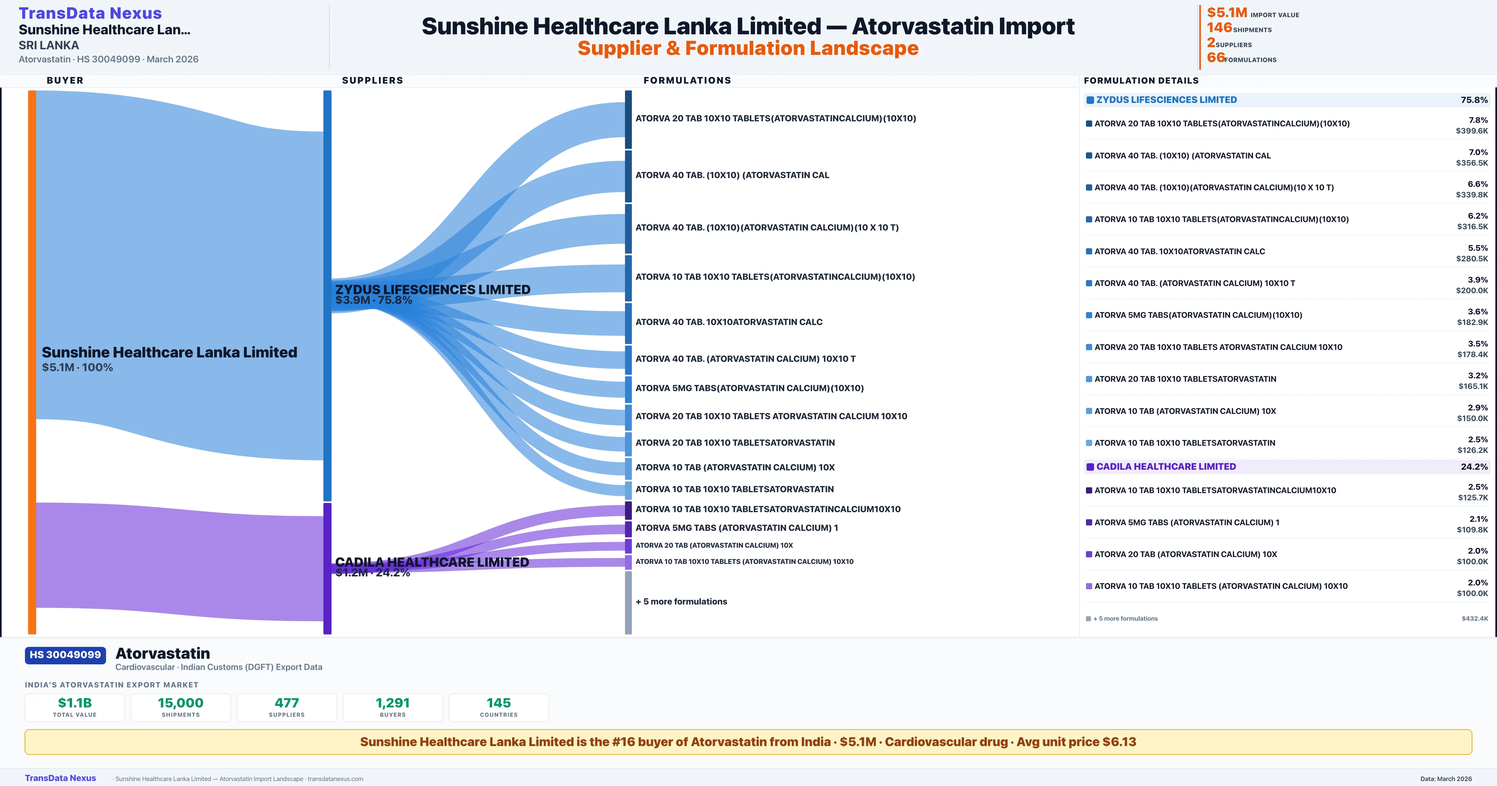 SUNSHINE HEALTHCARE LANKA LIMITED sources Atorvastatin from 2 verified Indian suppliers based on 146 customs records. The primary supplier is ZYDUS LIFESCIENCES LIMITED accounting for 75.8% of imports.