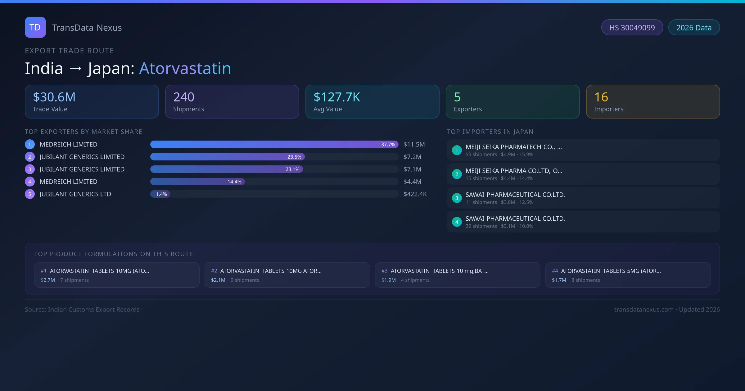 The leading Indian exporters of Atorvastatin to Japan are MEDREICH LIMITED, JUBILANT GENERICS LIMITED , JUBILANT GENERICS LIMITED. MEDREICH LIMITED holds the largest market share at approximately 38% of total trade value on this route.