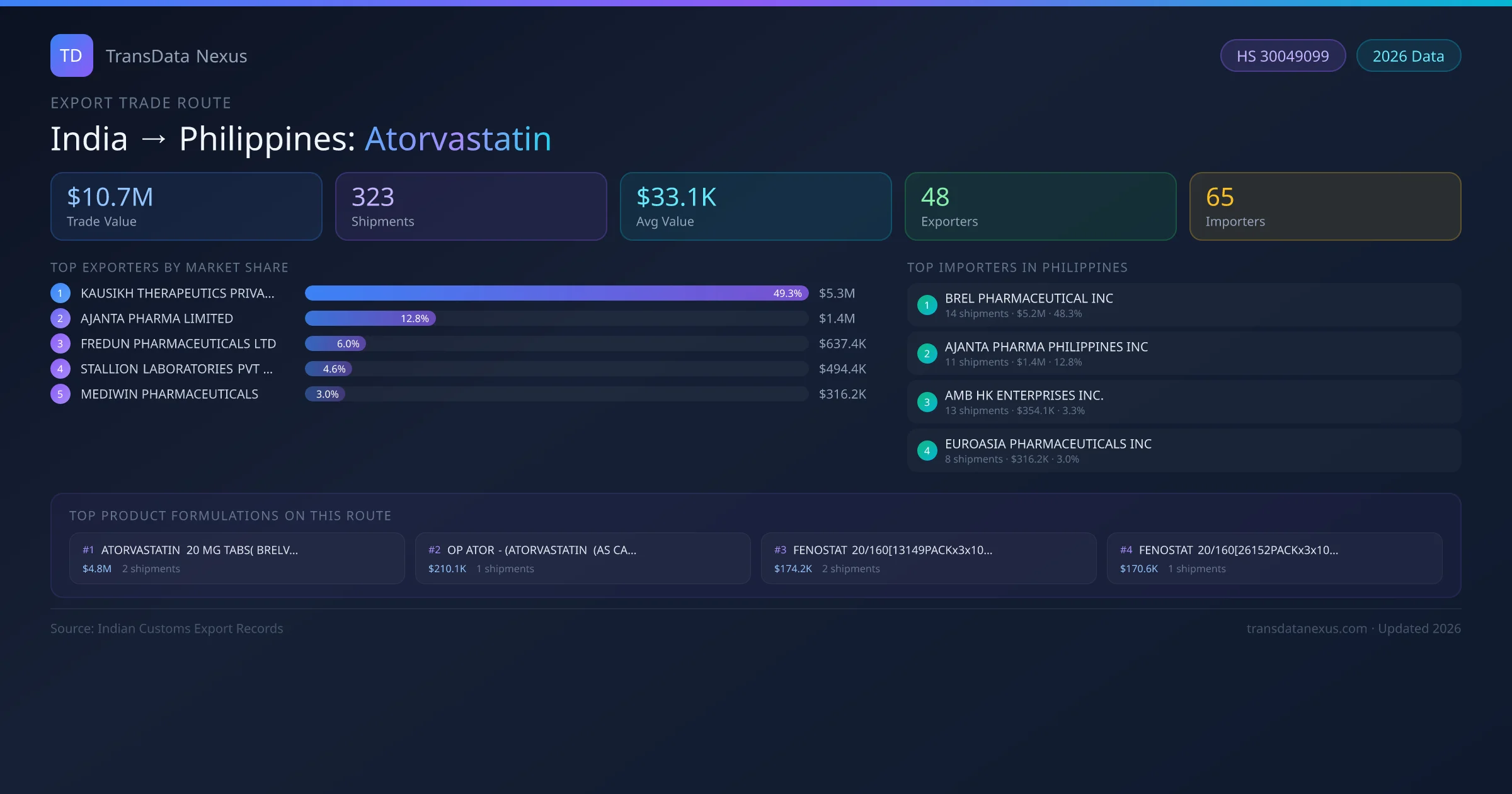 Showing top 10 of 231 product formulations shipped on the India to Philippines Atorvastatin route, ranked by trade value