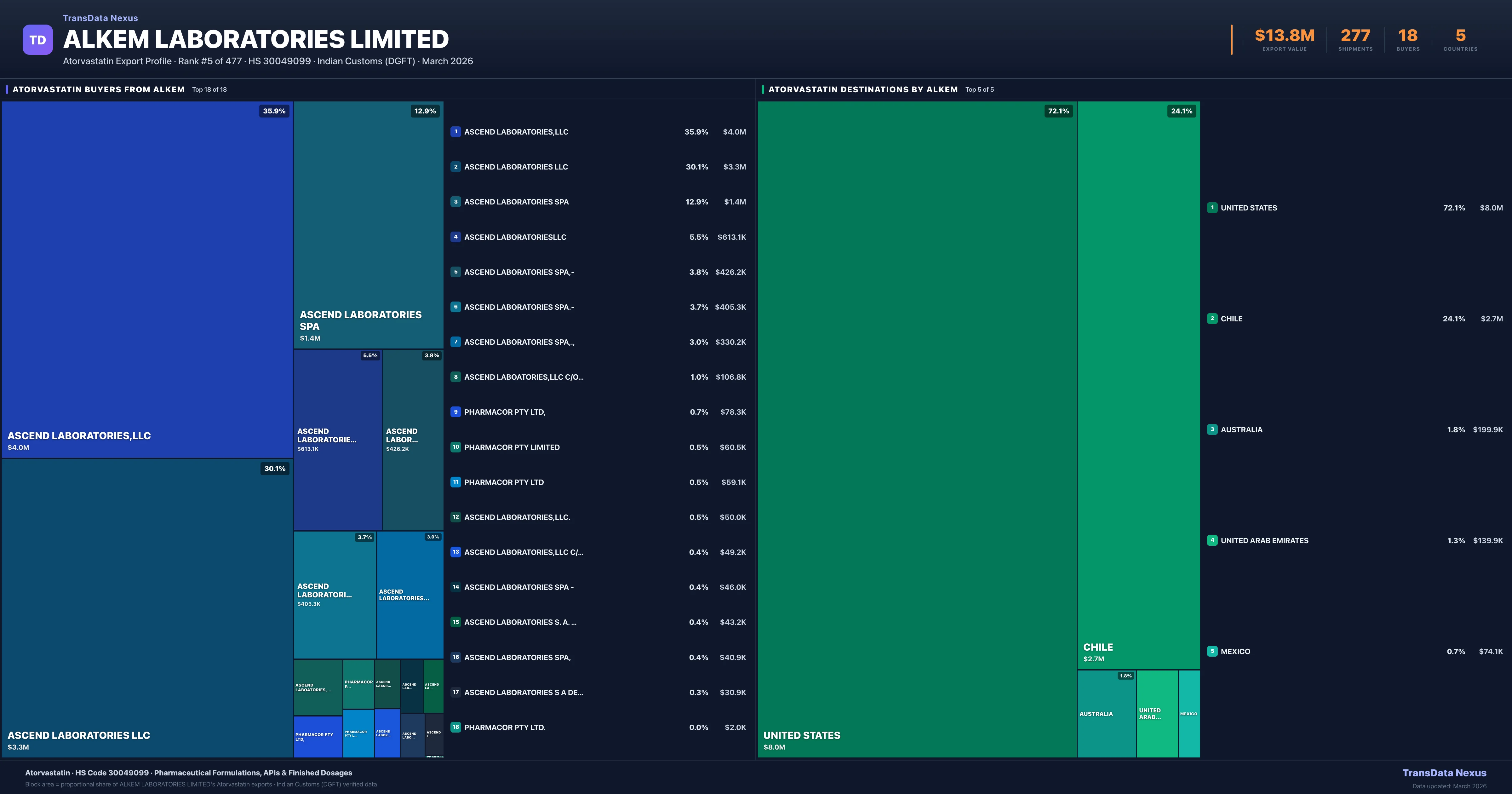 Access shipment-level details, pricing data, buyer connections, and competitive analysis for Alkem Laboratories Limited's Atorvastatin exports. TransData Nexus provides verified Indian Customs (DGFT) data trusted by pharmaceutical trade professionals worldwide.