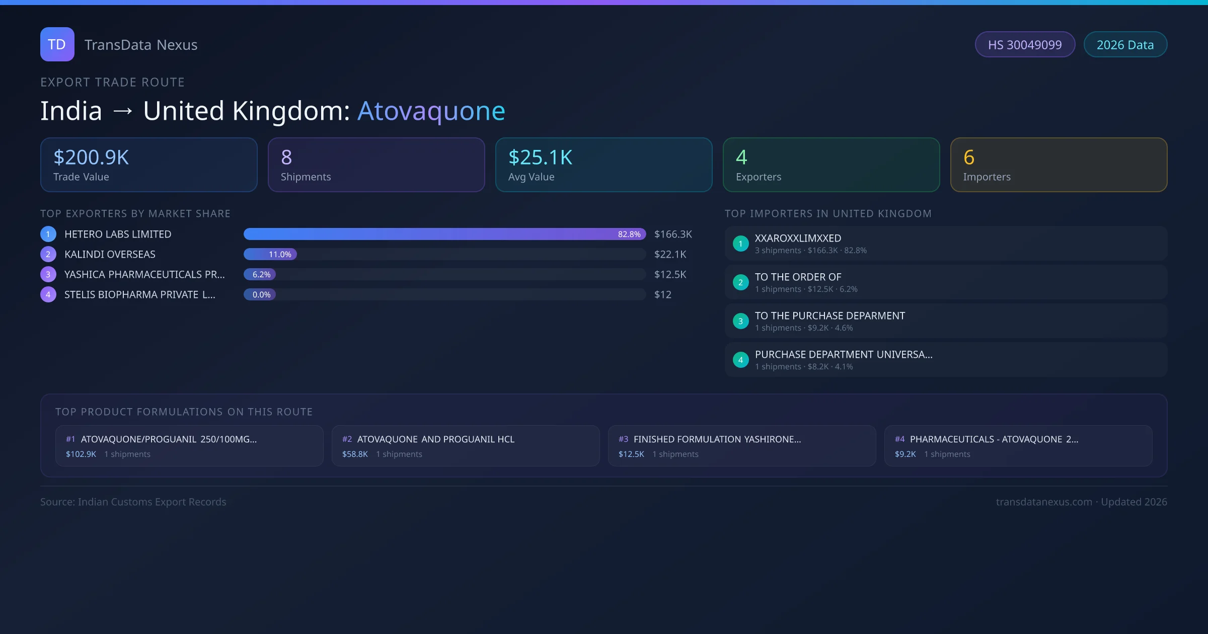 The India to United Kingdom Atovaquone corridor is one of India's established pharmaceutical export routes, with 8 shipments documented worth a combined $200.9K USD. The route is dominated by HETERO LABS LIMITED, which alone accounts for roughly 83% of all export value, reflecting the consolidated nature of India's atovaquone manufacturing sector.