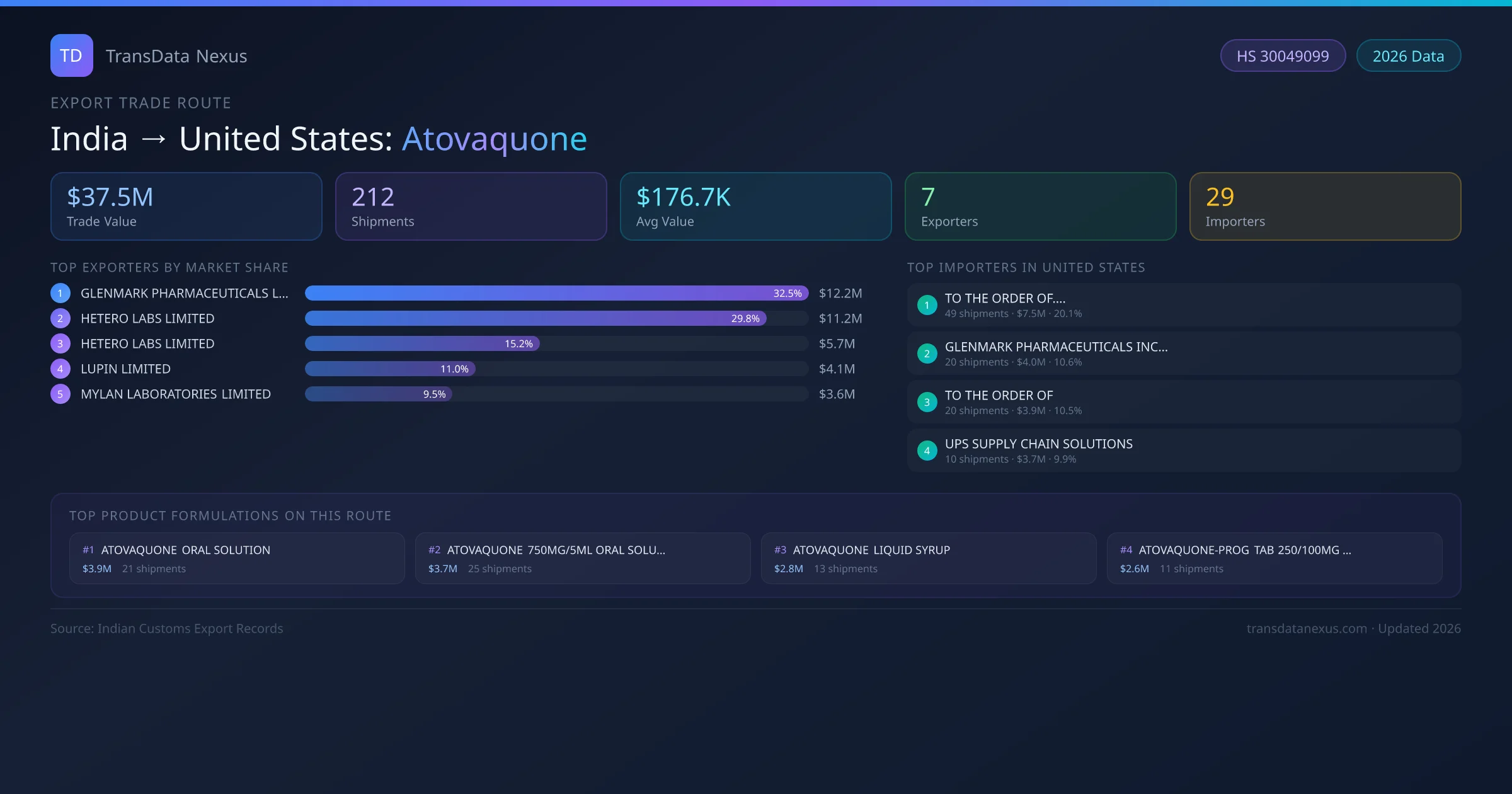 India has recorded 212 verified shipments of Atovaquone exported to United States, representing a combined trade value of $37.5M USD. This corridor is served by 7 active Indian exporters, with an average shipment value of $176.7K USD. The leading Indian exporter is GLENMARK PHARMACEUTICALS LIMITED, which accounts for 33% of total export value with 66 shipments worth $12.2M USD. On the buying side, TO THE ORDER OF.... is the largest importer in United States with $7.5M USD in purchases. The top 3 suppliers β GLENMARK PHARMACEUTICALS LIMITED, HETERO LABS LIMITED, HETERO LABS LIMITED β together control 78% of total trade value on this route. All data sourced from Indian Customs (DGFT) shipping bill records. Values reported in FOB USD.