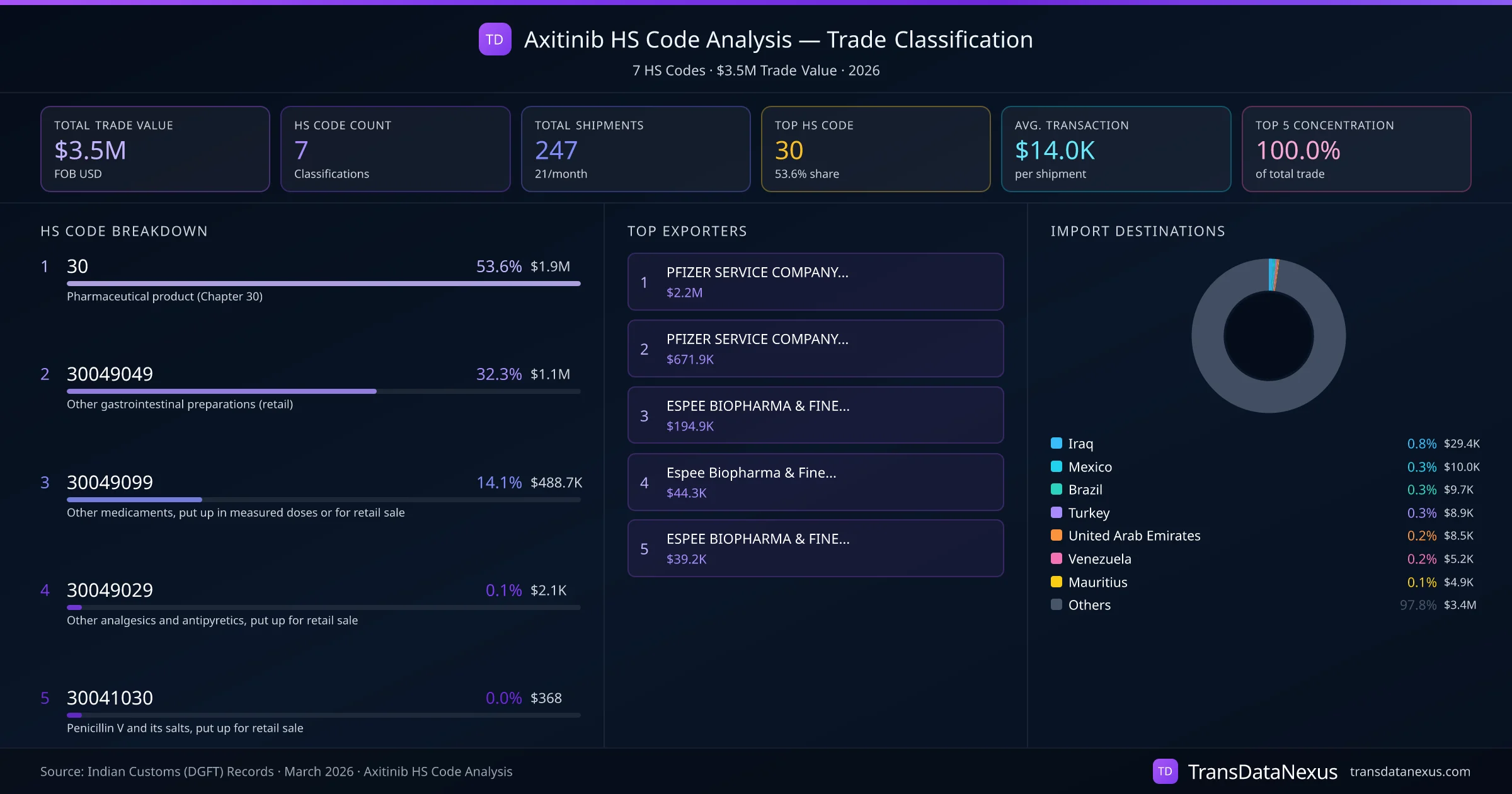 India exports Axitinib under 7 distinct HS code classifications, representing a total trade value of $3.5M across 247 shipments. The dominant classification is HS 30 (Pharmaceutical product (Chapter 30)), accounting for 53.6% of all Axitinib trade at $1.9M. HS 30049049 (Other gastrointestinal preparations (retail)) follows at 32.3% ($1.1M). The top 5 HS codes together account for 100.0% of total Axitinib trade from India. The average transaction value is $14049. Key importing markets include Iraq, Mexico, Brazil. Leading exporters include PFIZER SERVICE COMPANY BV and PFIZER SERVICE COMPANY BV. Data sourced from Indian Customs (DGFT) shipping bill records.