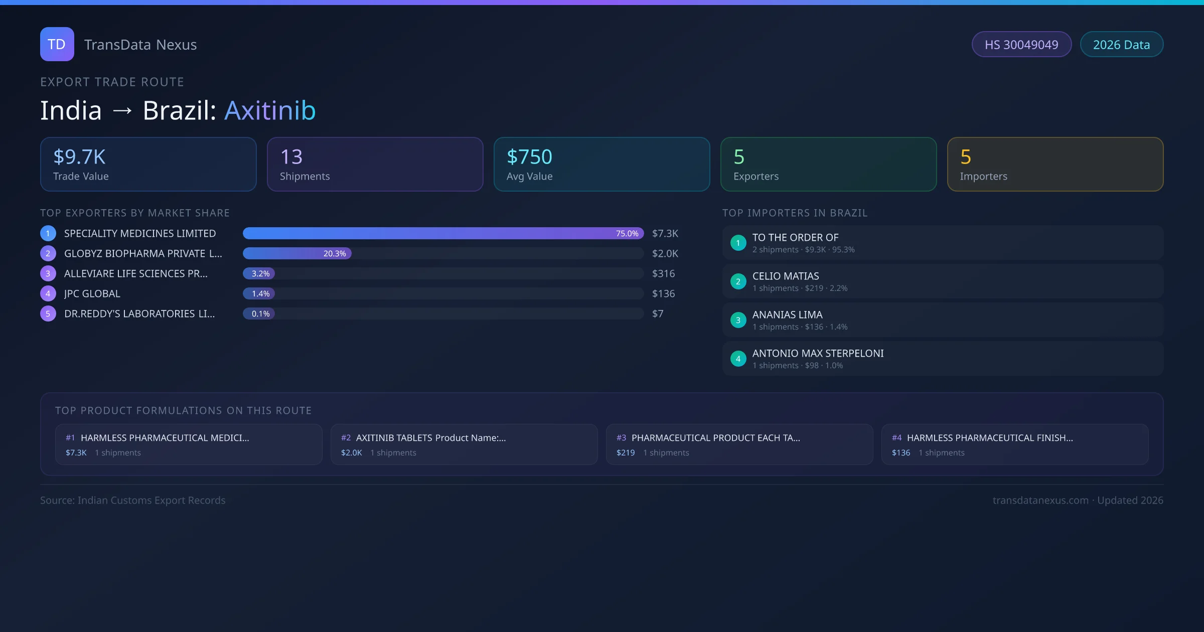 India has recorded 13 verified shipments of Axitinib exported to Brazil, representing a combined trade value of $9.7K USD. This corridor is served by 5 active Indian exporters, with an average shipment value of $750 USD. The leading Indian exporter is SPECIALITY MEDICINES LIMITED, which accounts for 75% of total export value with 1 shipments worth $7.3K USD. On the buying side, TO THE ORDER OF is the largest importer in Brazil with $9.3K USD in purchases. The top 3 suppliers — SPECIALITY MEDICINES LIMITED, GLOBYZ BIOPHARMA PRIVATE LIMITED, ALLEVIARE LIFE SCIENCES PRIVATE LIMITED — together control 99% of total trade value on this route. All data sourced from Indian Customs (DGFT) shipping bill records. Values reported in FOB USD.