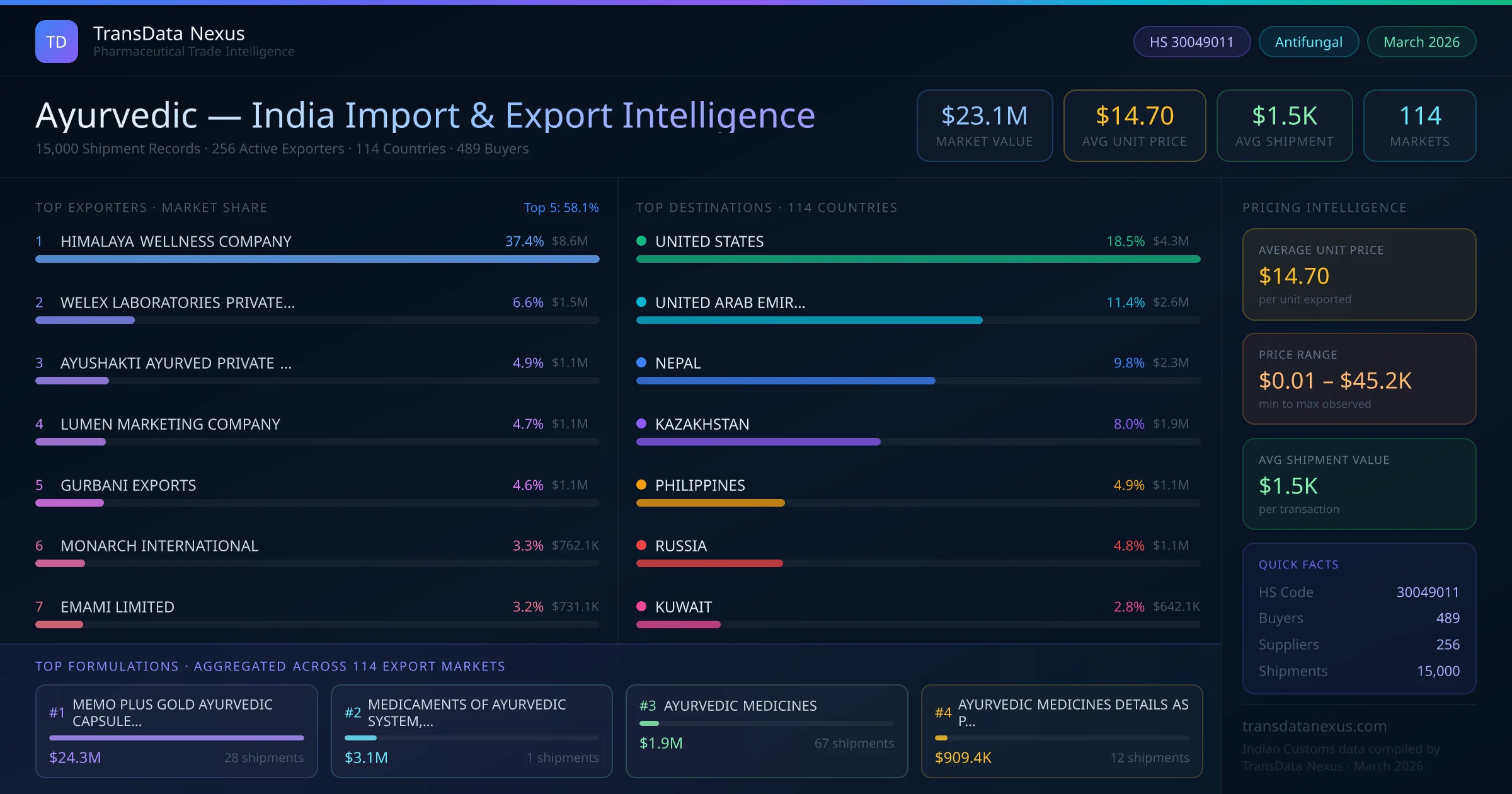 Between 2022 and 2026, India exported $23.1M worth of ayurvedic across 15,000 verified shipments to 114 countries — covering 58% of world markets in the Ayurvedic & Herbal Products segment. The largest destination is UNITED STATES (18.5%). HIMALAYA WELLNESS COMPANY leads with a 37.4% share. All figures are drawn from Indian Customs (DGFT) shipping bill records spanning four years of trade activity.