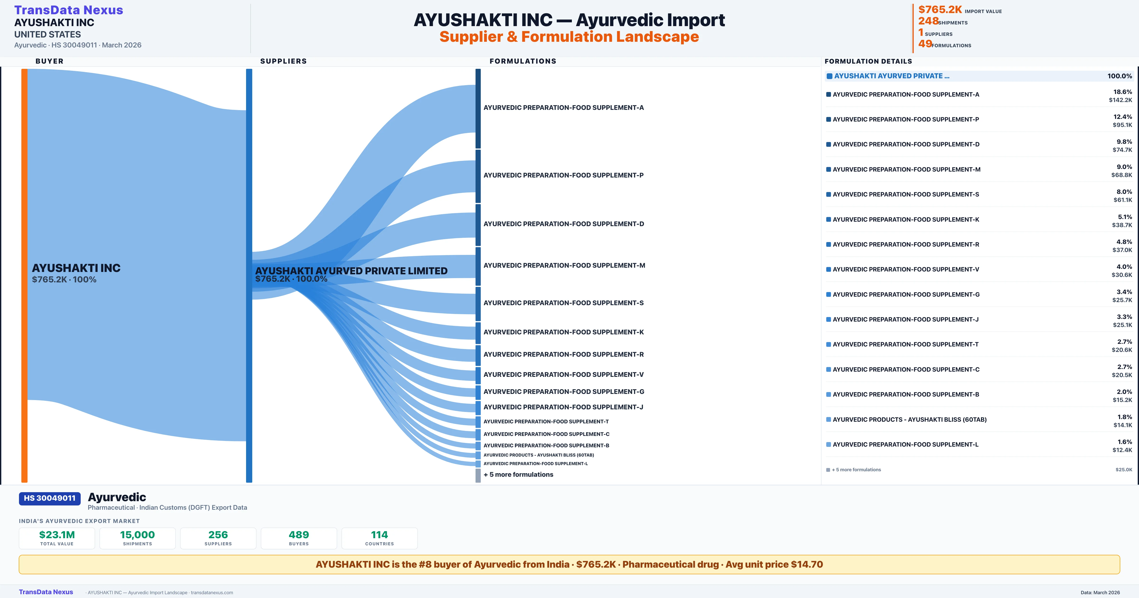 AYUSHAKTI INC sources Ayurvedic from 1 verified Indian supplier: AYUSHAKTI AYURVED PRIVATE LIMITED ($765.2K, 100.0%). This is based on 248 customs records.