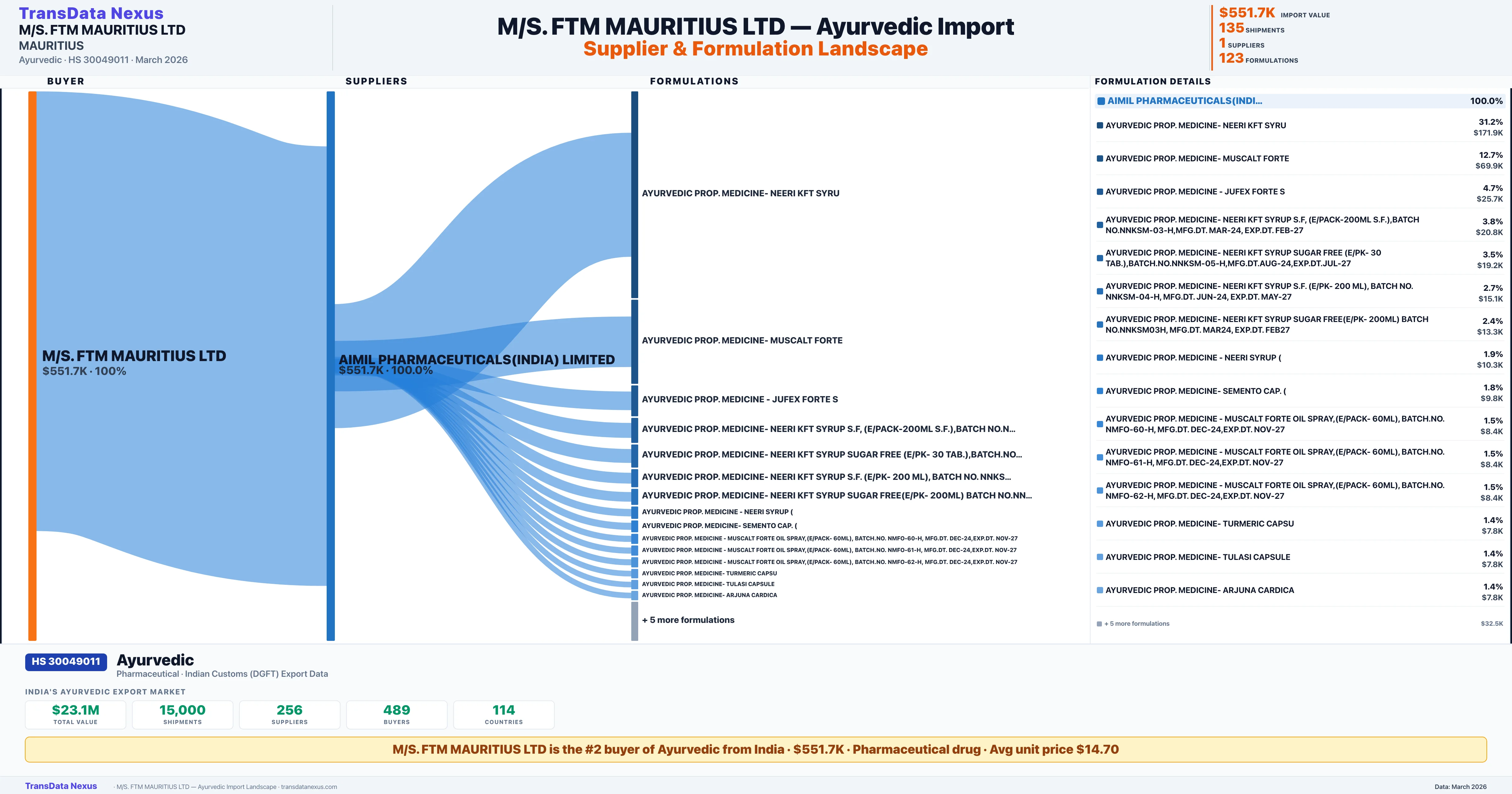 M/S. FTM MAURITIUS LTD sources Ayurvedic from 1 verified Indian supplier: AIMIL PHARMACEUTICALS(INDIA) LIMITED ($551.7K, 100.0%). This is based on 135 customs records.