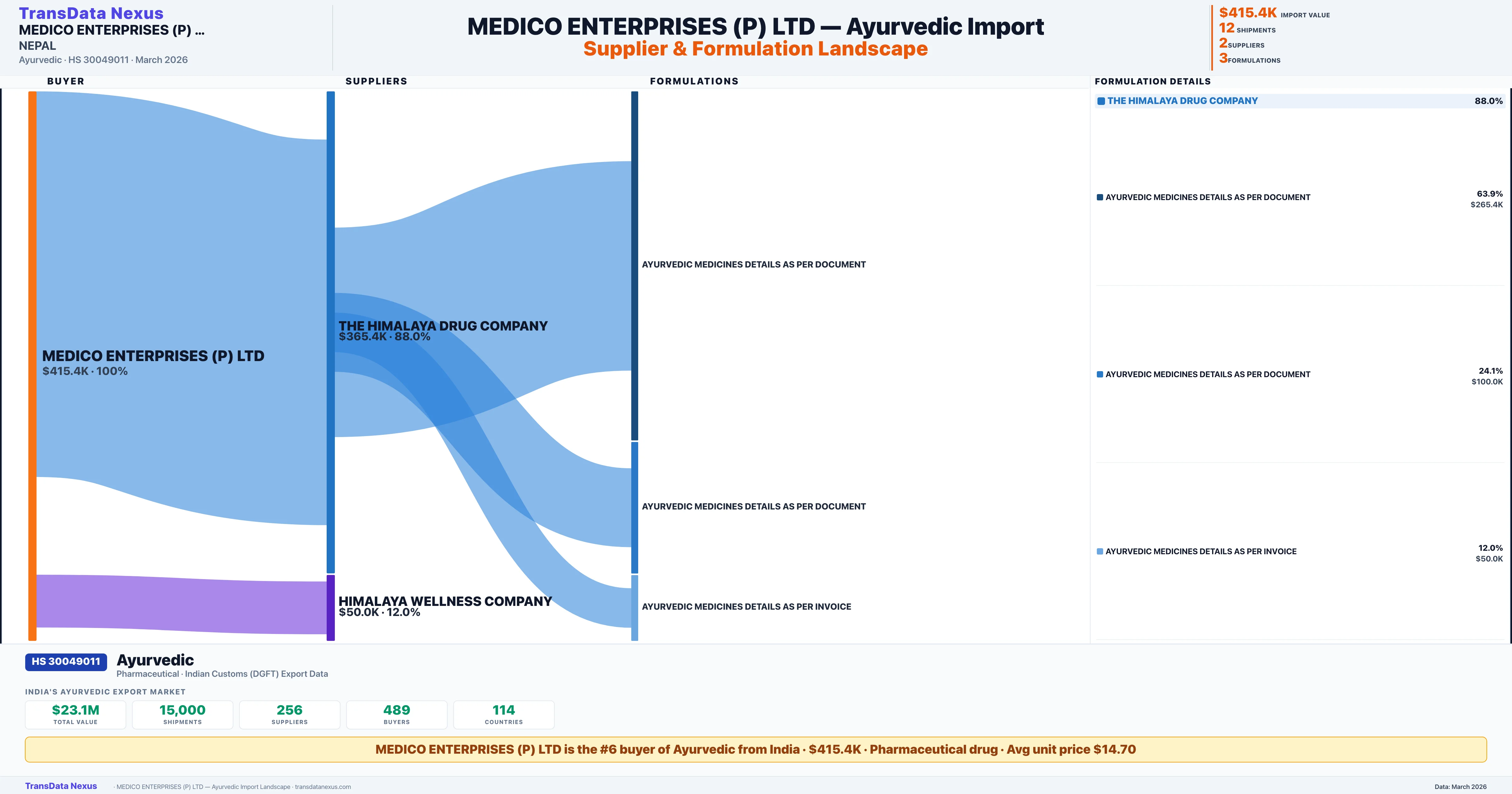 MEDICO ENTERPRISES (P) LTD sources Ayurvedic from 2 verified Indian suppliers: THE HIMALAYA DRUG COMPANY ($365.4K, 88.0%), HIMALAYA WELLNESS COMPANY ($50.0K, 12.0%). This is based on 12 customs records.