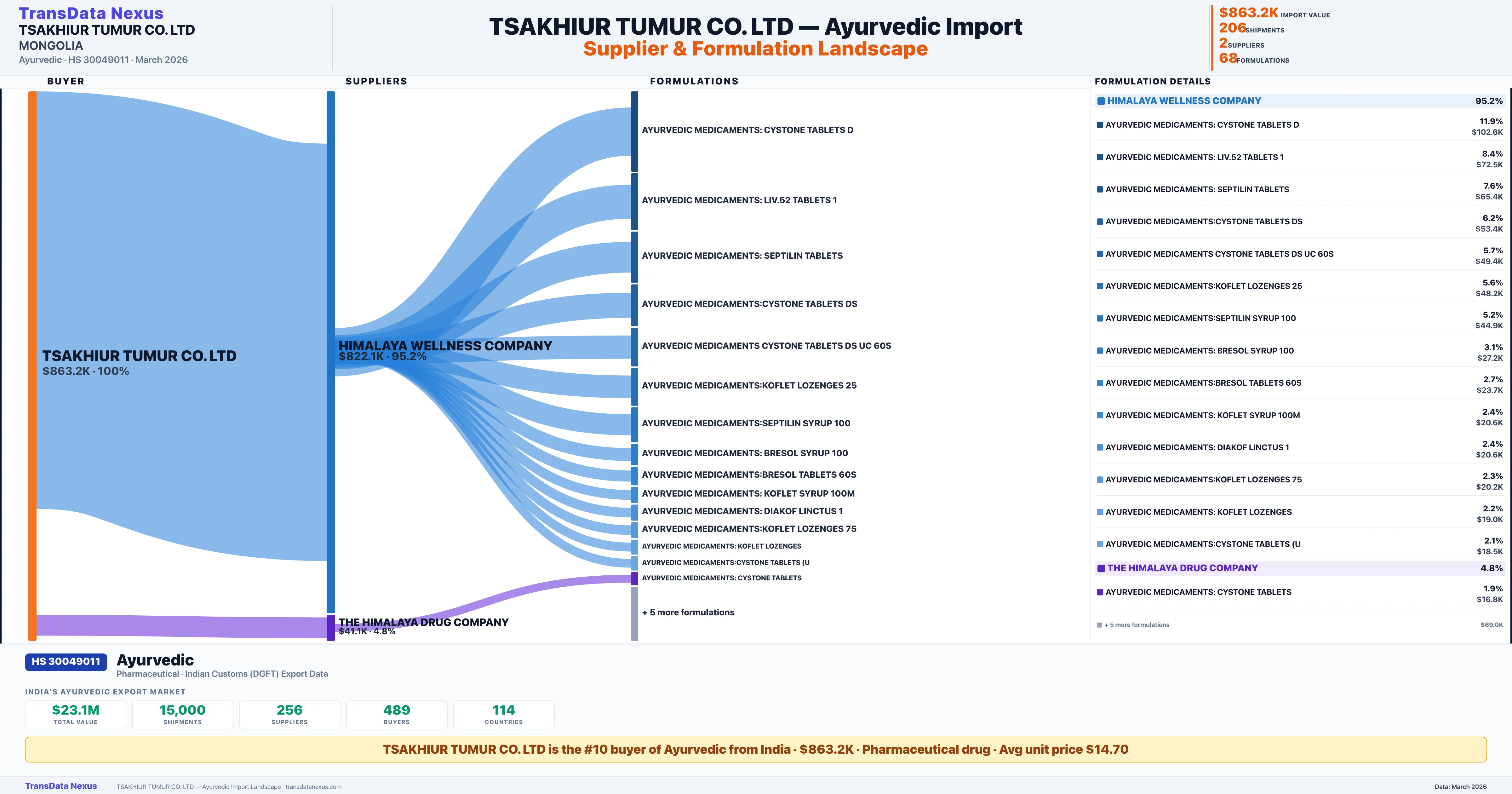 India exported $10.7M worth of Ayurvedic through 15,000 shipments from 256 suppliers to 114 countries, serving 489 buyers globally. TSAKHIUR TUMUR CO. LTD imports $863.2K of this total, accounting for 2.6% of India's Ayurvedic exports with 206 shipments from MONGOLIA. This is verified from 206 customs shipment records covering 68 distinct formulations.