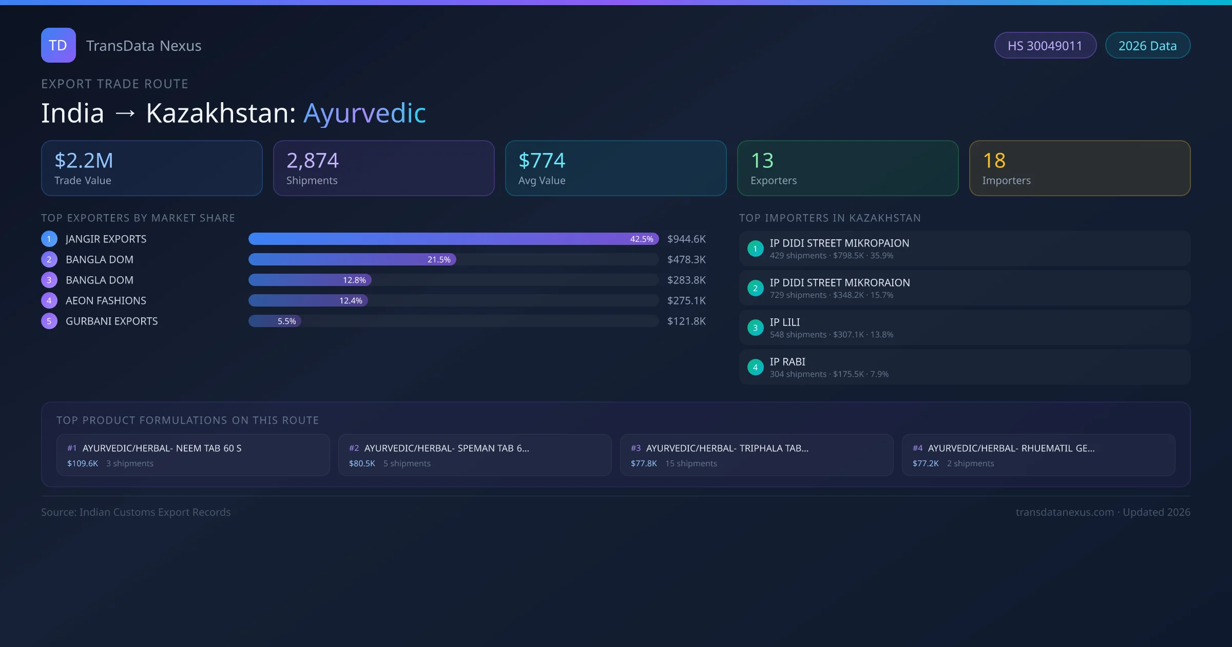 The India to Kazakhstan Ayurvedic corridor is one of India's established pharmaceutical export routes, with 2,874 shipments documented worth a combined $2.2M USD. The route is dominated by JANGIR EXPORTS, which alone accounts for roughly 42% of all export value, reflecting the consolidated nature of India's ayurvedic manufacturing sector.