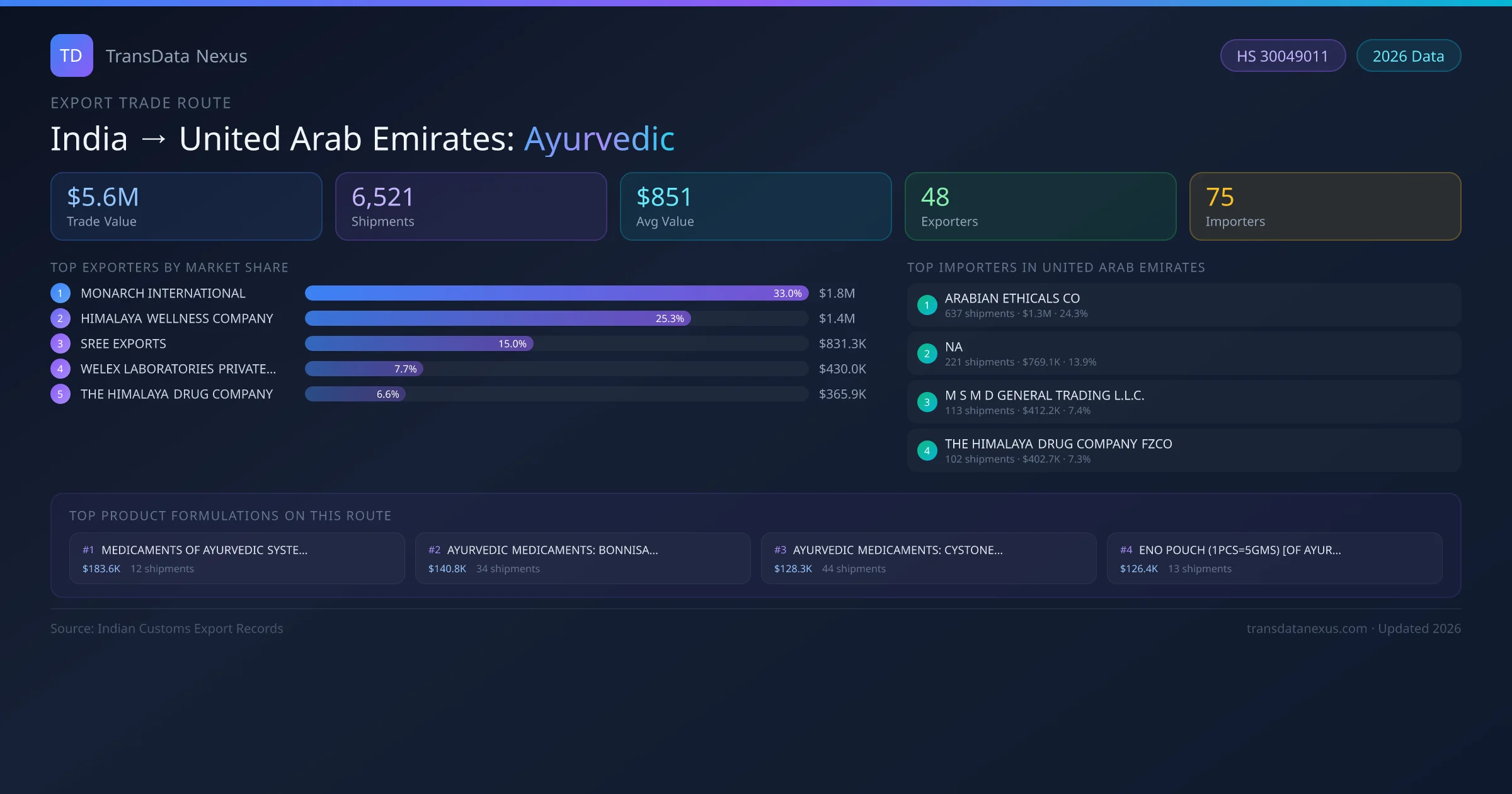 The leading Indian exporters of Ayurvedic to United Arab Emirates are MONARCH INTERNATIONAL, HIMALAYA WELLNESS COMPANY, SREE EXPORTS. MONARCH INTERNATIONAL holds the largest market share at approximately 33% of total trade value on this route.