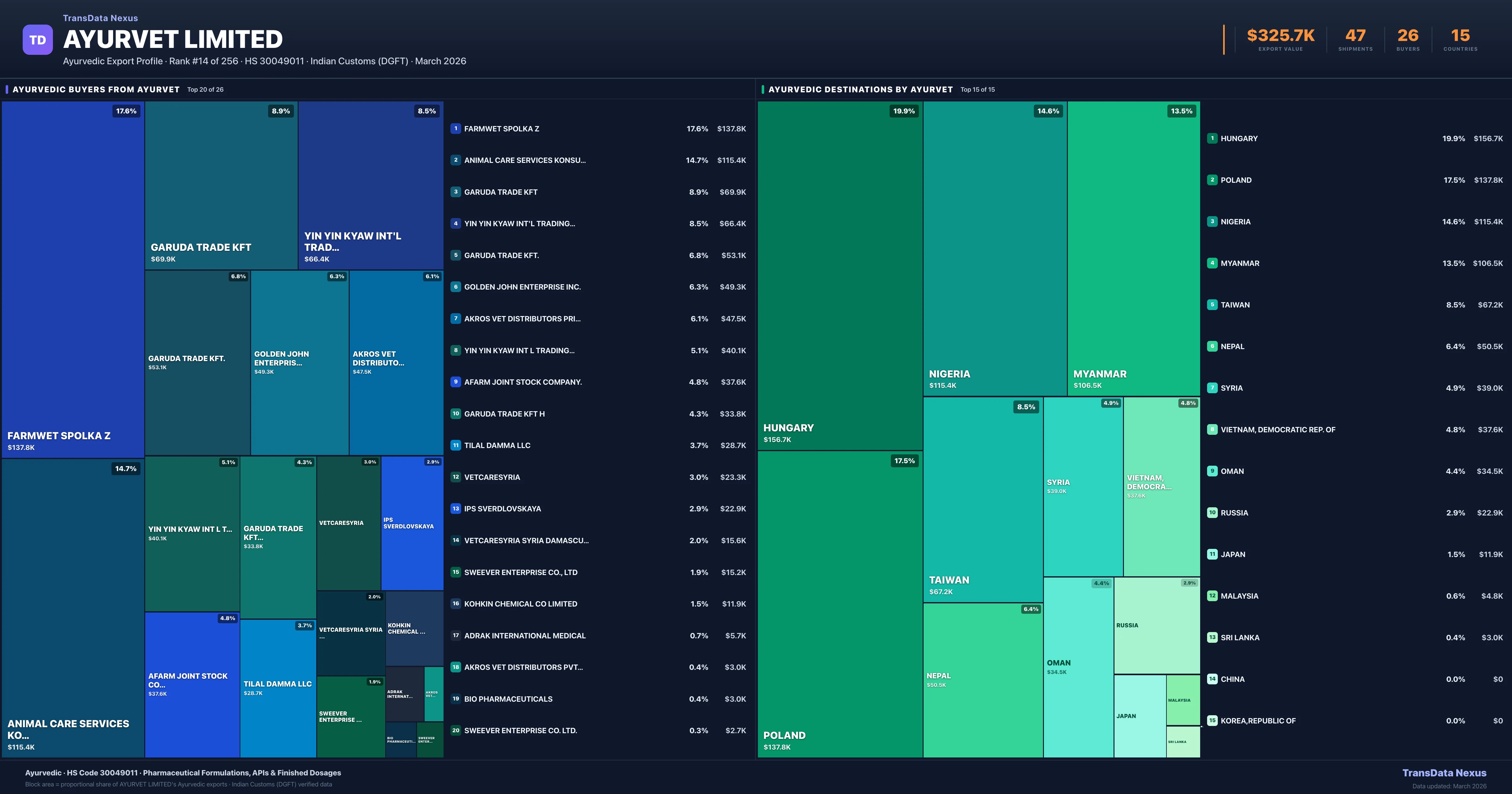 Ayurvet Limited's average Ayurvedic shipment value is $6.9K per consignment, based on 47 shipments totaling $325.7K. The largest destination is HUNGARY (19.9% of Ayurvet Limited's Ayurvedic exports).