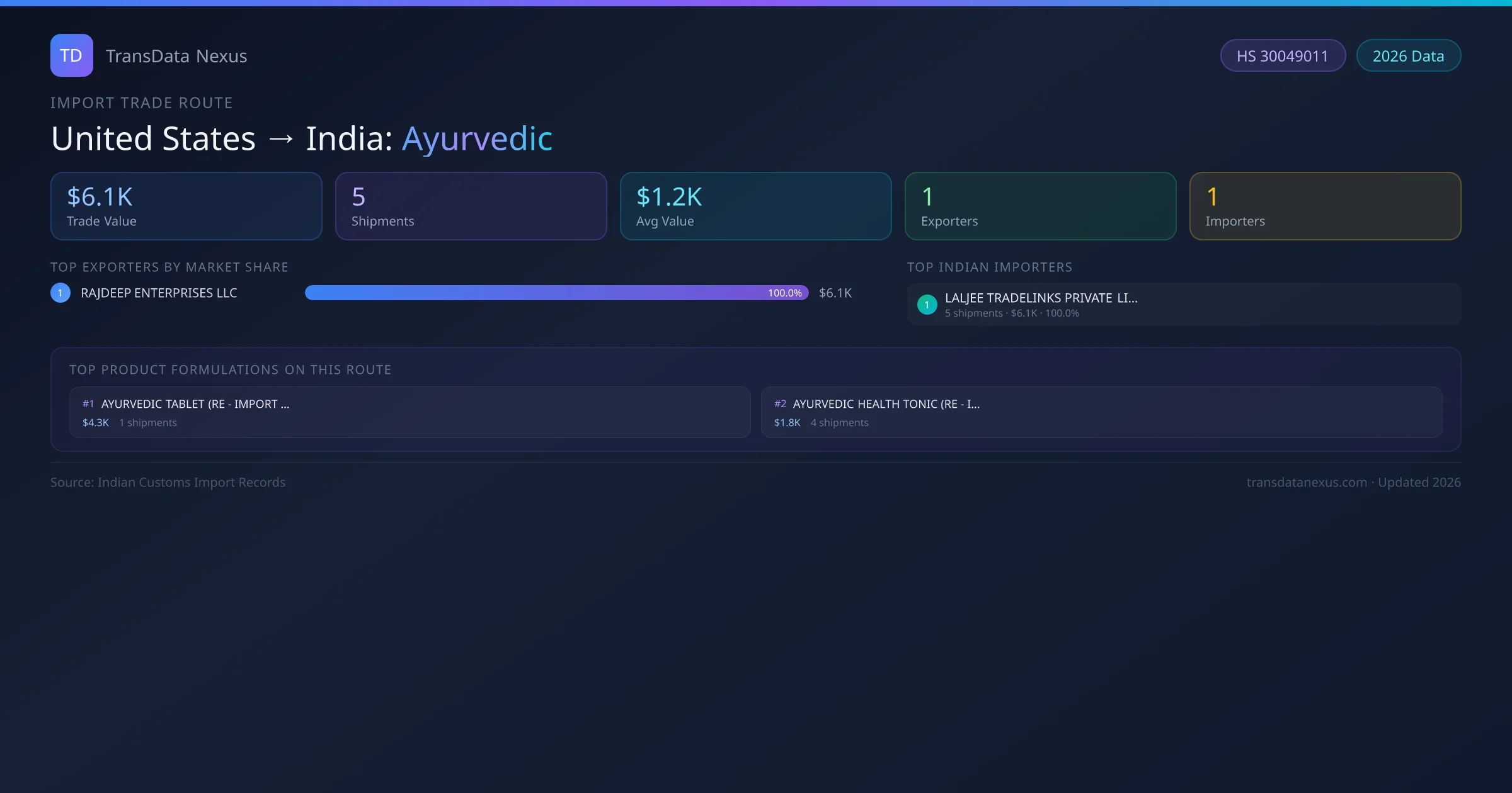India has recorded 5 verified shipments of Ayurvedic imported from United States, representing a combined trade value of $6.1K USD. This corridor is served by 1 active United States exporters, with an average shipment value of $1.2K USD. The leading United States supplier is RAJDEEP ENTERPRISES LLC, which accounts for 100% of total import value with 5 shipments worth $6.1K USD. On the buying side, LALJEE TRADELINKS PRIVATE LIMITED is the largest Indian importer with $6.1K USD in purchases. All data sourced from Indian Customs (DGFT) shipping bill of entry records. Values reported in FOB USD.