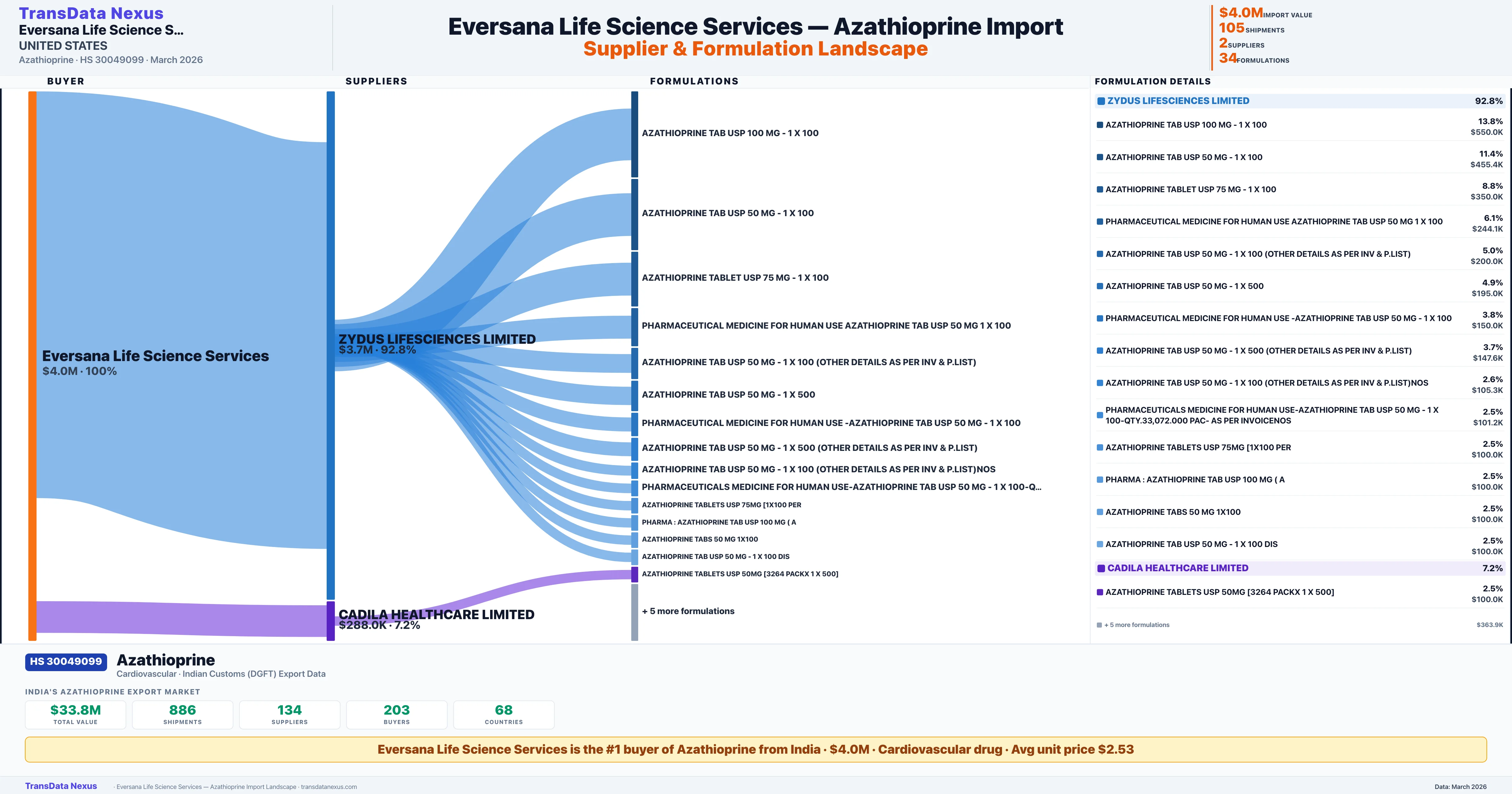 EVERSANA LIFE SCIENCE SERVICES sources Azathioprine from 2 verified Indian suppliers: ZYDUS LIFESCIENCES LIMITED ($3.7M, 92.8%), CADILA HEALTHCARE LIMITED ($288.0K, 7.2%). This is based on 105 customs records.