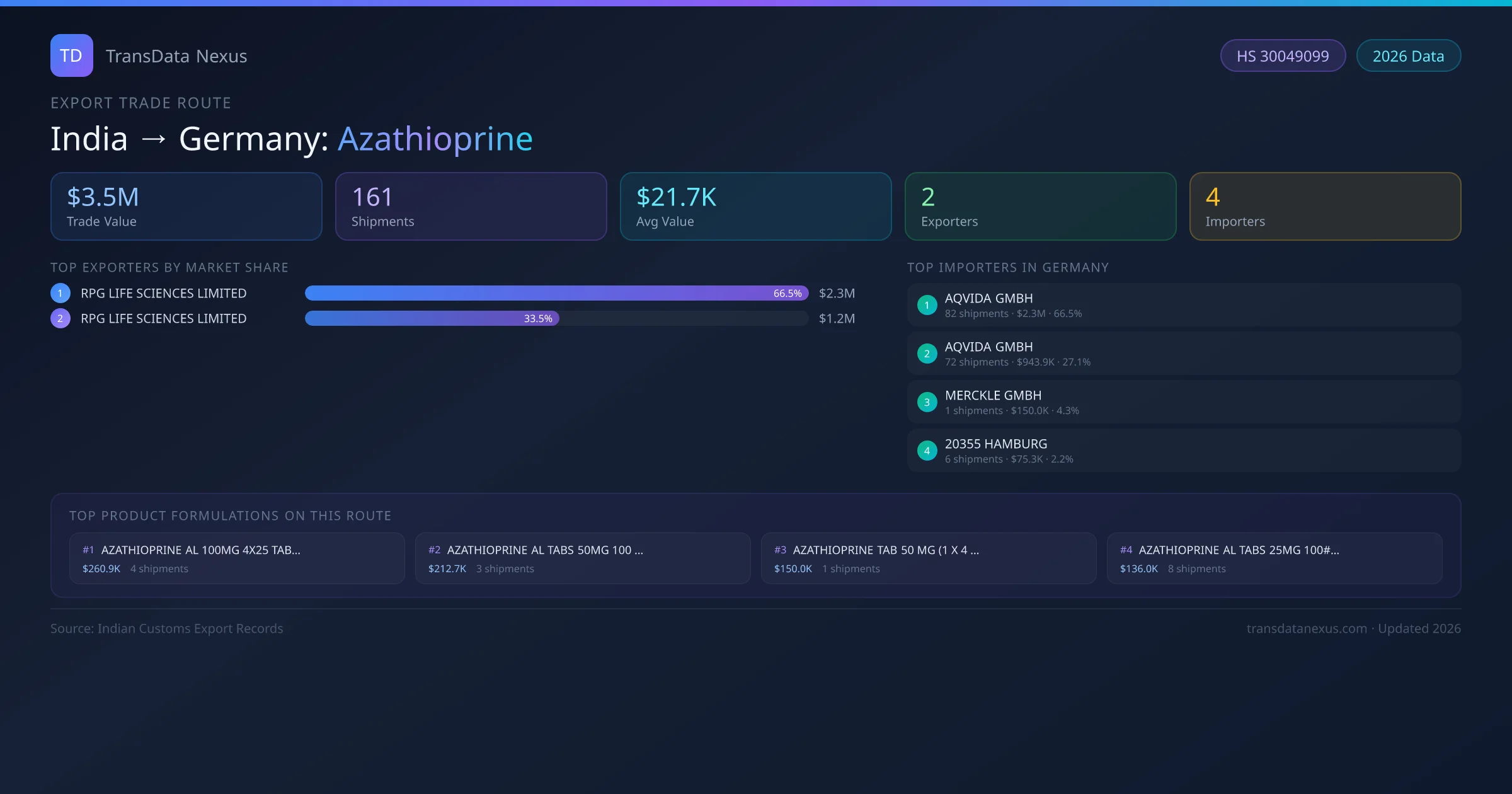 - 1.Route Identification: India to Germany export trade corridor identified from Indian Customs (DGFT) records for Azathioprine.