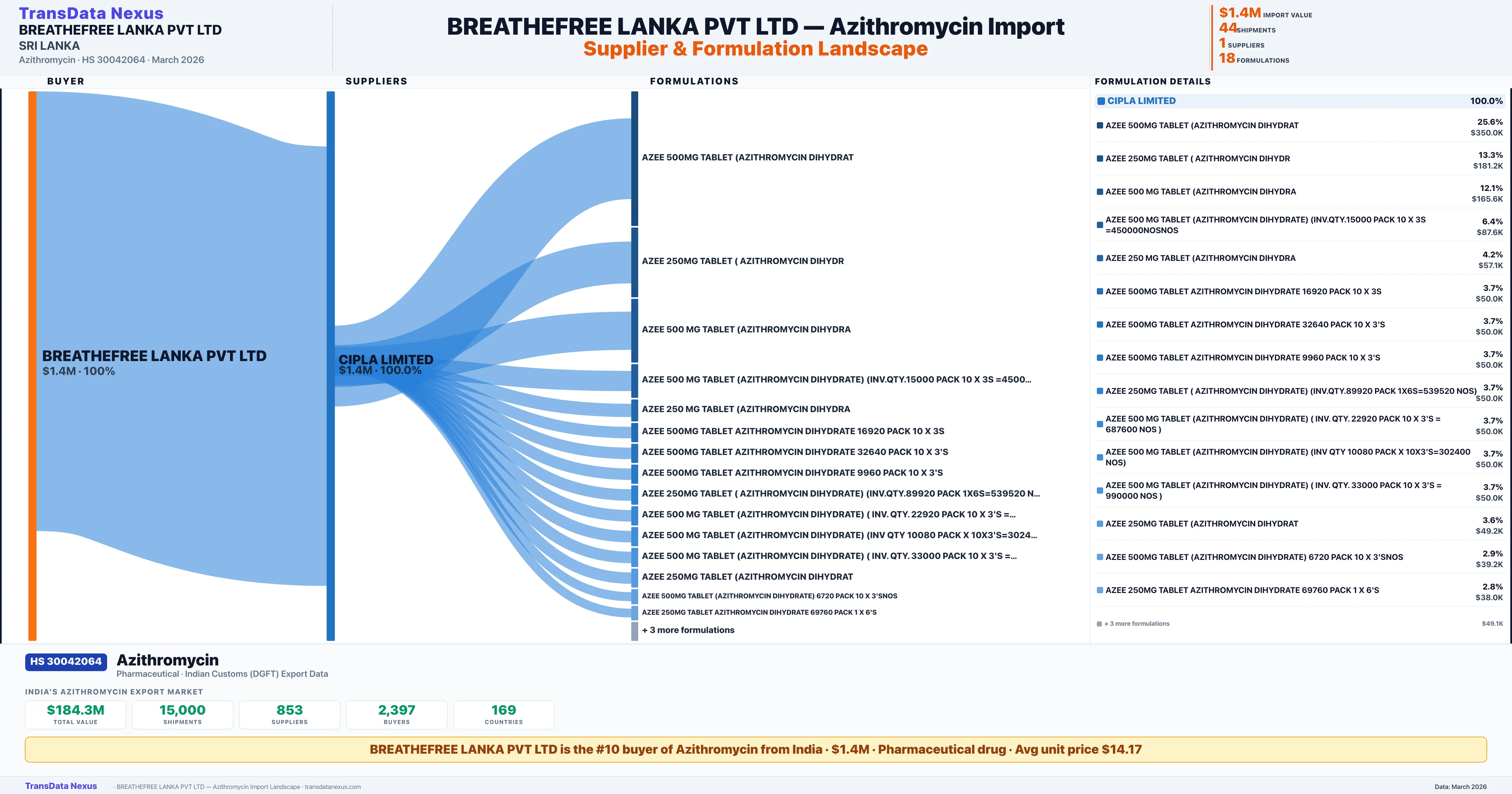 BREATHEFREE LANKA PVT LTD sources Azithromycin from 1 verified Indian supplier: CIPLA LIMITED ($1.4M, 100.0%). This is based on 44 customs records.
