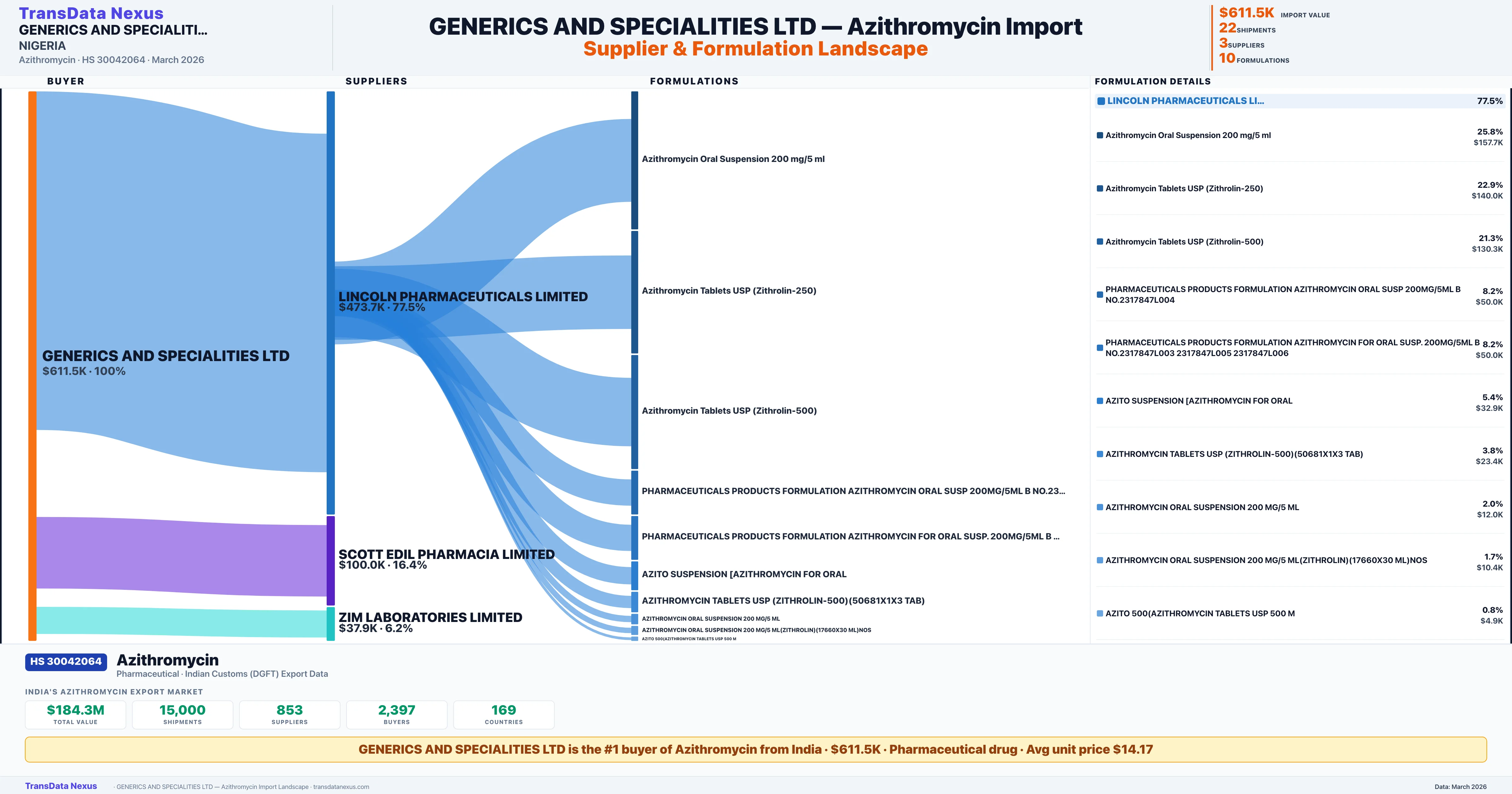 GENERICS AND SPECIALITIES LTD sources Azithromycin from 3 verified Indian suppliers: LINCOLN PHARMACEUTICALS LIMITED ($473.7K, 77.5%), SCOTT EDIL PHARMACIA LIMITED ($100.0K, 16.4%), ZIM LABORATORIES LIMITED ($37.9K, 6.2%). This is based on 22 customs records.