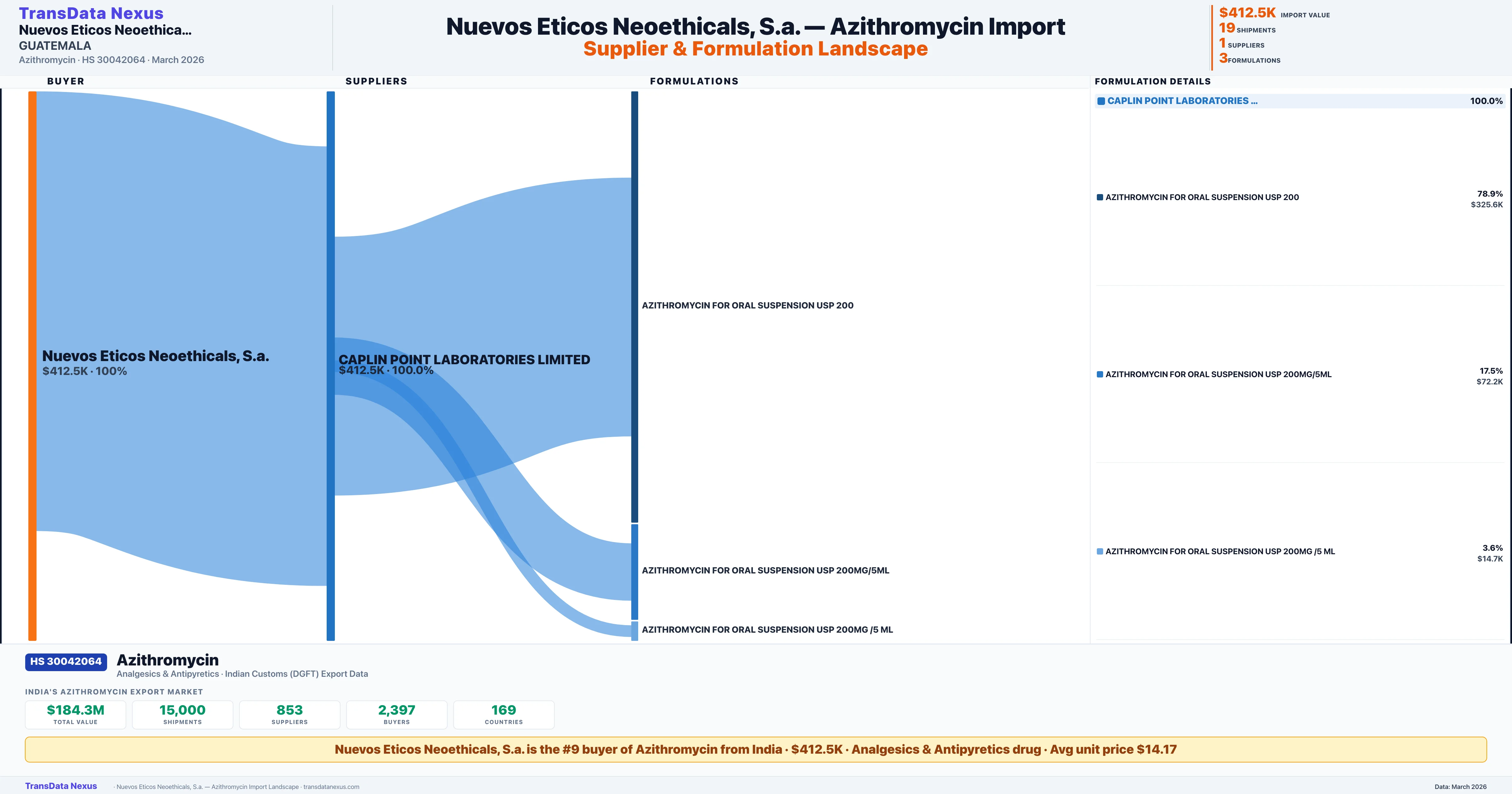 NUEVOS ETICOS NEOETHICALS, S.A. sources Azithromycin from 1 verified Indian supplier: CAPLIN POINT LABORATORIES LIMITED ($412.5K, 100.0%). This is based on 19 customs records.