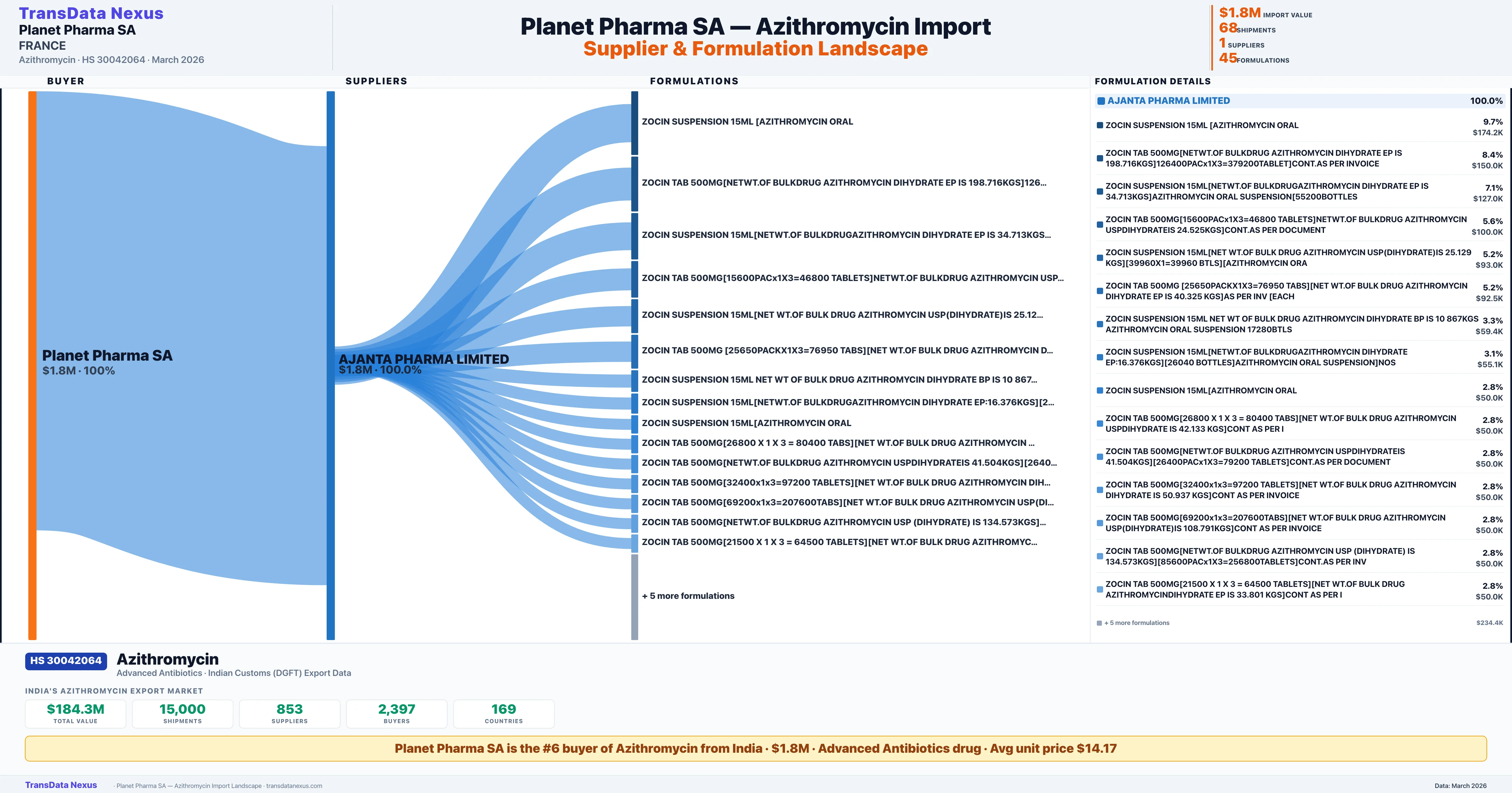 Access order-level details, pricing data, supplier connections, and competitive analysis for PLANET PHARMA SA's Azithromycin imports. TransData Nexus provides verified Indian Customs (DGFT) data trusted by pharmaceutical trade professionals worldwide.