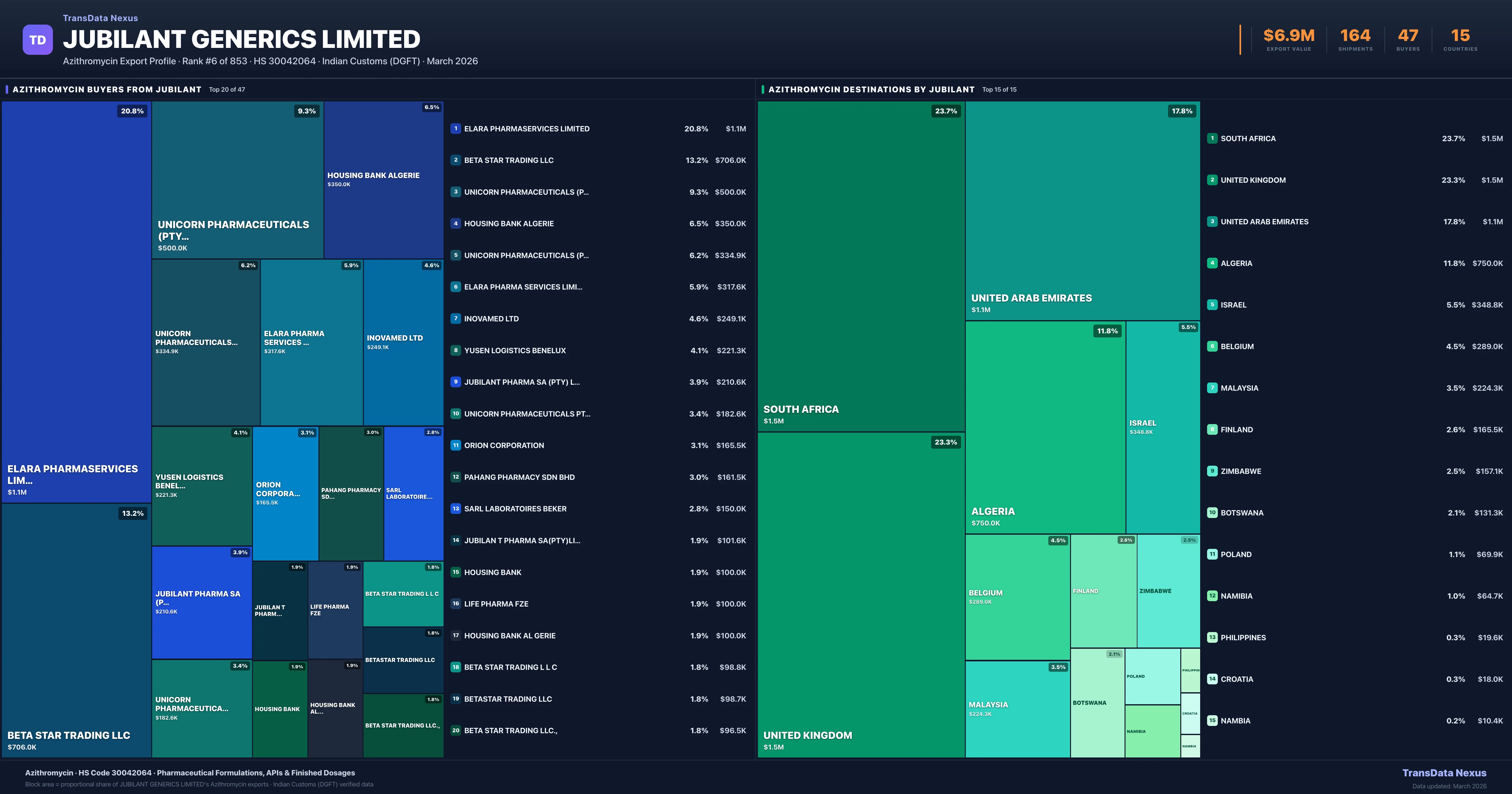 Jubilant Generics Limited supplies Azithromycin to 47 buyers globally. The largest buyer is ELARA PHARMASERVICES LIMITED (UNITED KINGDOM), followed by BETA STAR TRADING LLC (UNITED ARAB EMIRATES) and UNICORN PHARMACEUTICALS (PTY)LTD (SOUTH AFRICA). These buyers represent pharmaceutical distributors, hospital groups, and government procurement agencies in their respective markets.