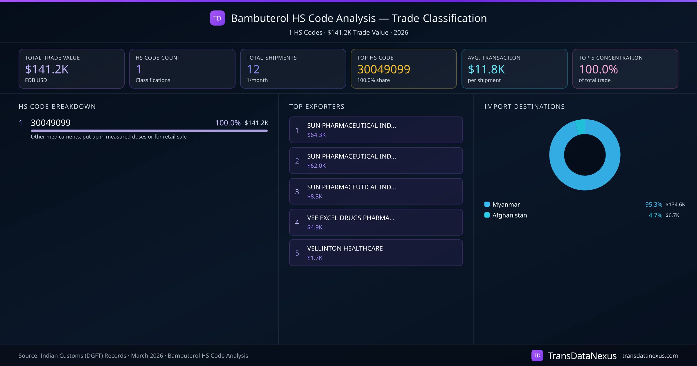 India exports Bambuterol under 1 distinct HS code classifications, representing a total trade value of $141.2K across 12 shipments. The dominant classification is HS 30049099 (Other medicaments, put up in measured doses or for retail sale), accounting for 100.0% of all Bambuterol trade at $141.2K. The top 5 HS codes together account for 100.0% of total Bambuterol trade from India. The average transaction value is $11769. Key importing markets include MYANMAR , Myanmar, MYANMAR. Leading exporters include SUN PHARMACEUTICAL INDUSTRIES LIMITED and SUN PHARMACEUTICAL INDUSTRIES LTD. Data sourced from Indian Customs (DGFT) shipping bill records.