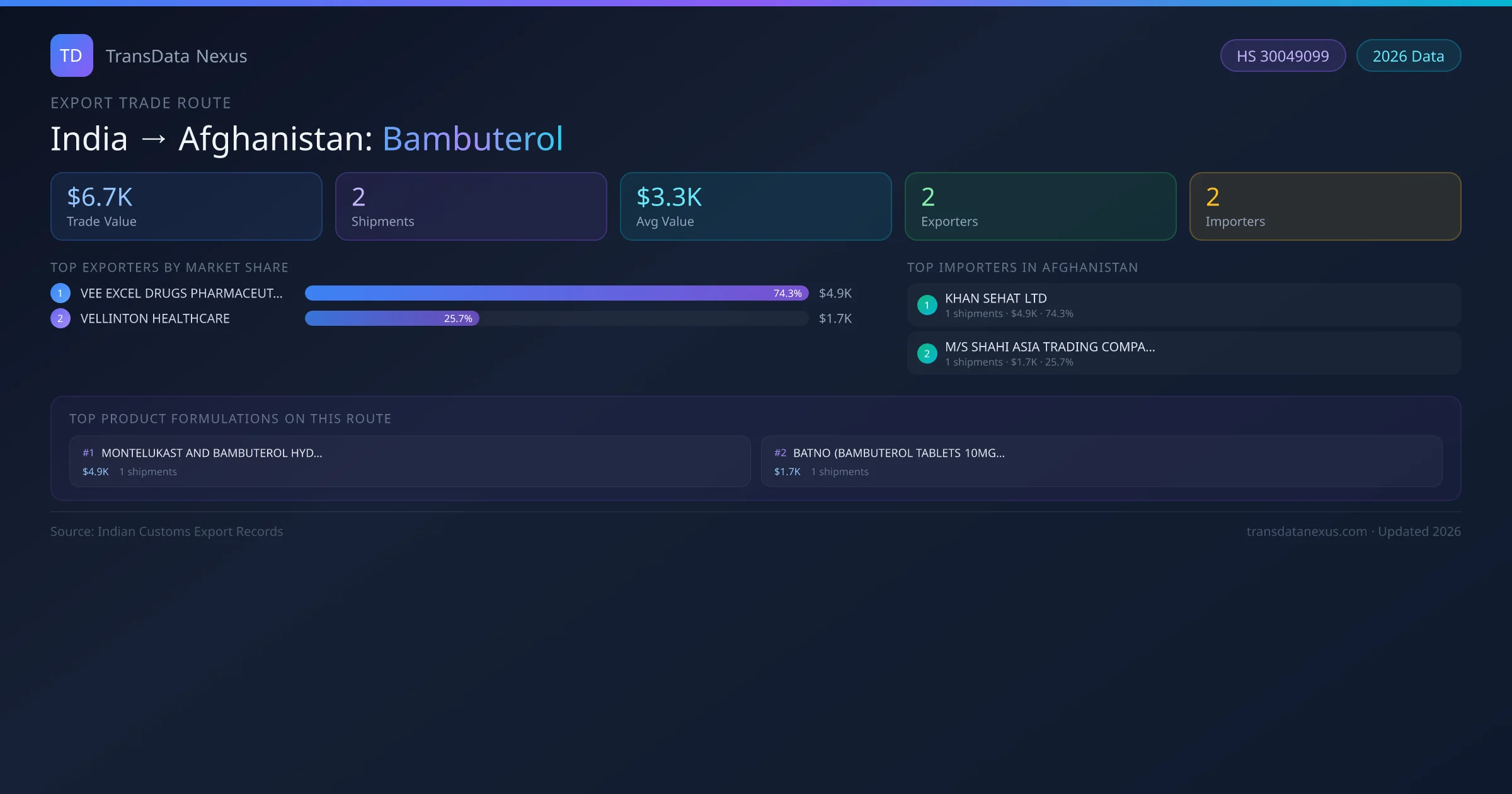India has recorded 2 verified shipments of Bambuterol exported to Afghanistan, representing a combined trade value of $6.7K USD. This corridor is served by 2 active Indian exporters, with an average shipment value of $3.3K USD. The leading Indian exporter is VEE EXCEL DRUGS PHARMACEUTICALS PVT LTD, which accounts for 74% of total export value with 1 shipments worth $4.9K USD. On the buying side, KHAN SEHAT LTD is the largest importer in Afghanistan with $4.9K USD in purchases. All data sourced from Indian Customs (DGFT) shipping bill records. Values reported in FOB USD.