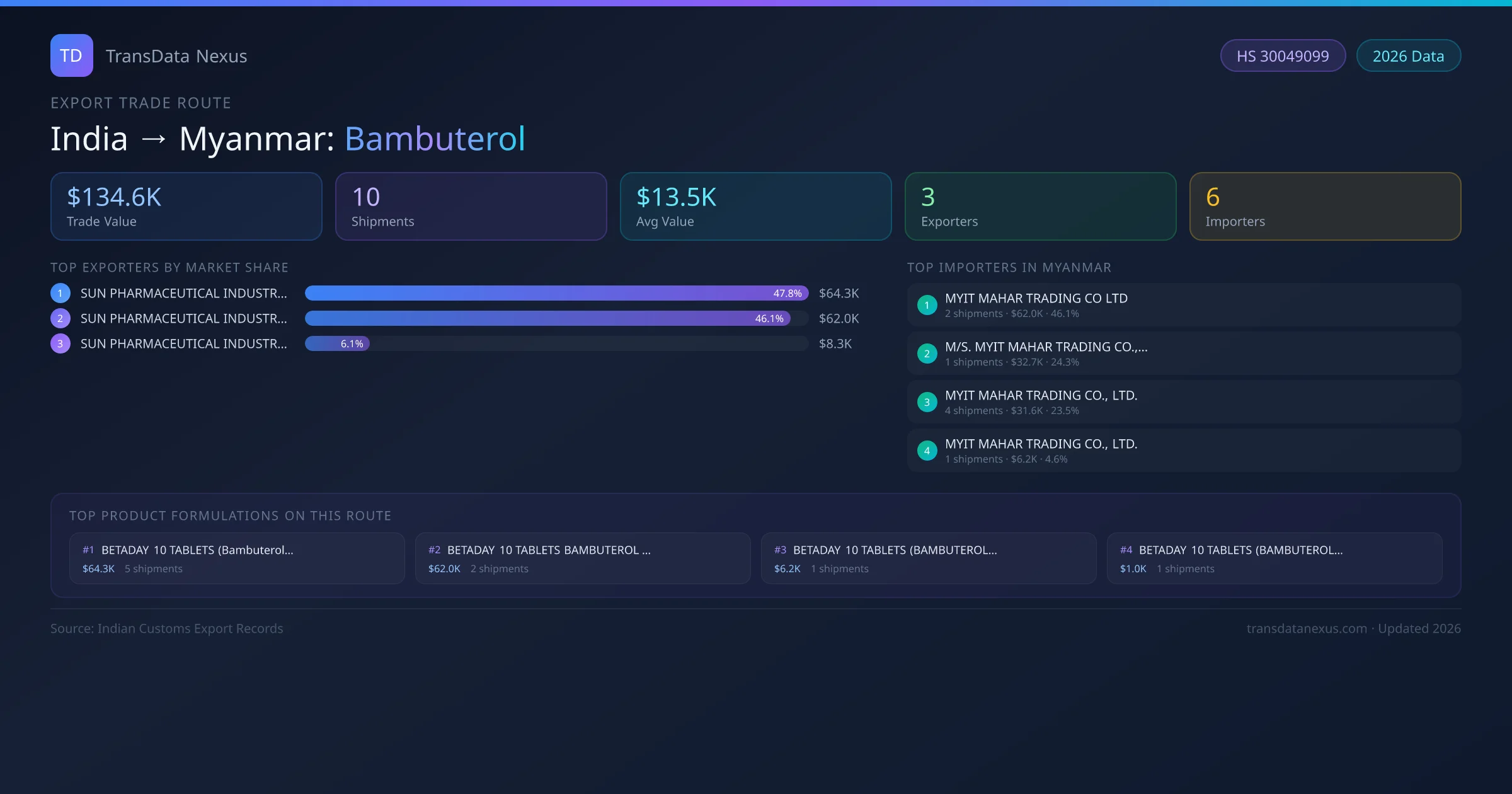 India has recorded 10 verified shipments of Bambuterol exported to Myanmar, representing a combined trade value of $134.6K USD. This corridor is served by 3 active Indian exporters, with an average shipment value of $13.5K USD. The leading Indian exporter is SUN PHARMACEUTICAL INDUSTRIES LIMITED , which accounts for 48% of total export value with 5 shipments worth $64.3K USD. On the buying side, MYIT MAHAR TRADING CO LTD is the largest importer in Myanmar with $62.0K USD in purchases. The top 3 suppliers — SUN PHARMACEUTICAL INDUSTRIES LIMITED , SUN PHARMACEUTICAL INDUSTRIES LTD, SUN PHARMACEUTICAL INDUSTRIES LIMITED — together control 100% of total trade value on this route. All data sourced from Indian Customs (DGFT) shipping bill records. Values reported in FOB USD.