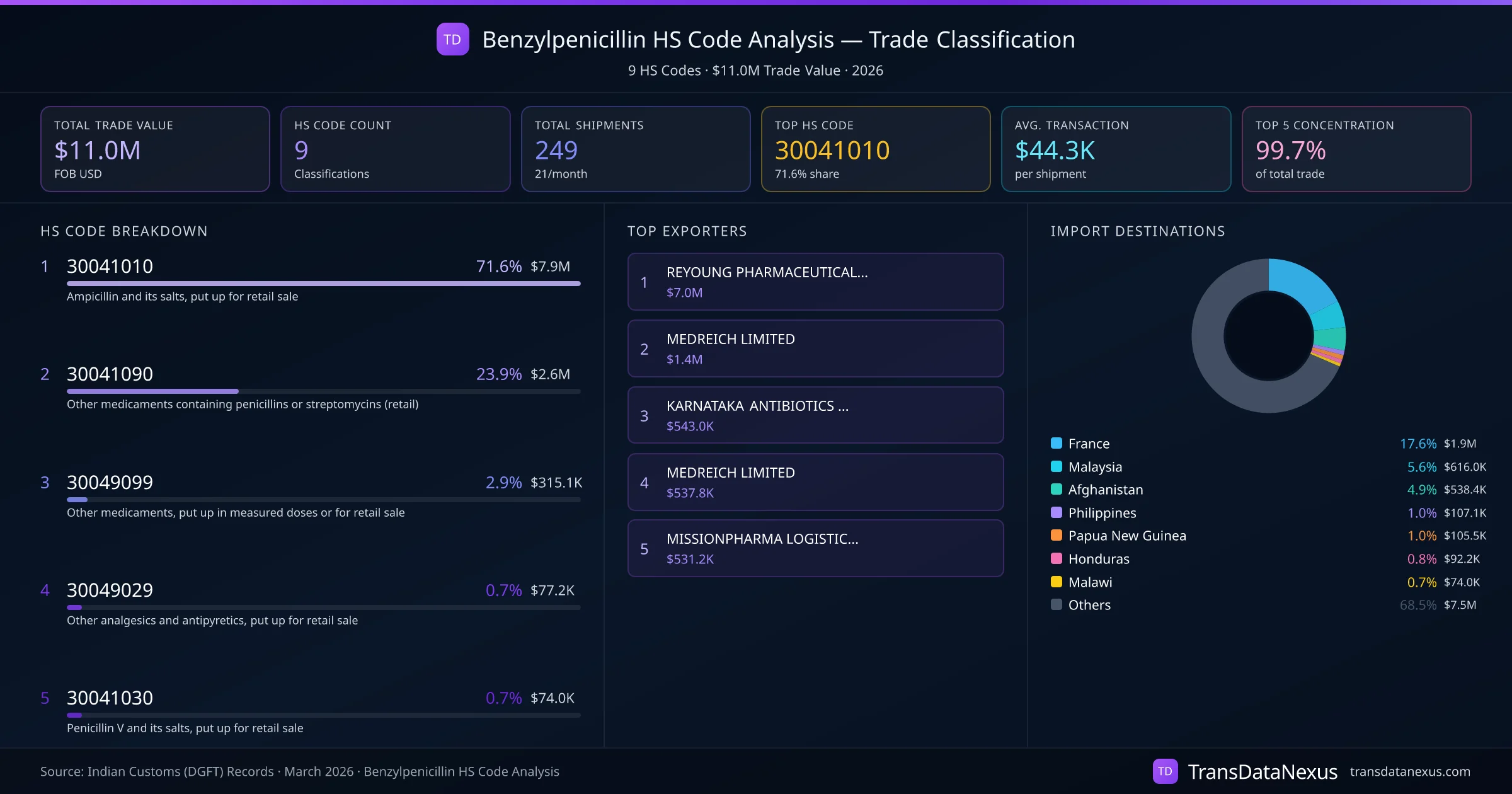 India exports Benzylpenicillin under 9 distinct HS code classifications, representing a total trade value of $11.0M across 249 shipments. The dominant classification is HS 30041010 (Ampicillin and its salts, put up for retail sale), accounting for 71.6% of all Benzylpenicillin trade at $7.9M. HS 30041090 (Other medicaments containing penicillins or streptomycins (retail)) follows at 23.9% ($2.6M). The top 5 HS codes together account for 99.7% of total Benzylpenicillin trade from India. The average transaction value is $44258. Key importing markets include France, Malaysia, Afghanistan. Leading exporters include REYOUNG PHARMACEUTICAL CO LIMITED and MEDREICH LIMITED. Data sourced from Indian Customs (DGFT) shipping bill records.