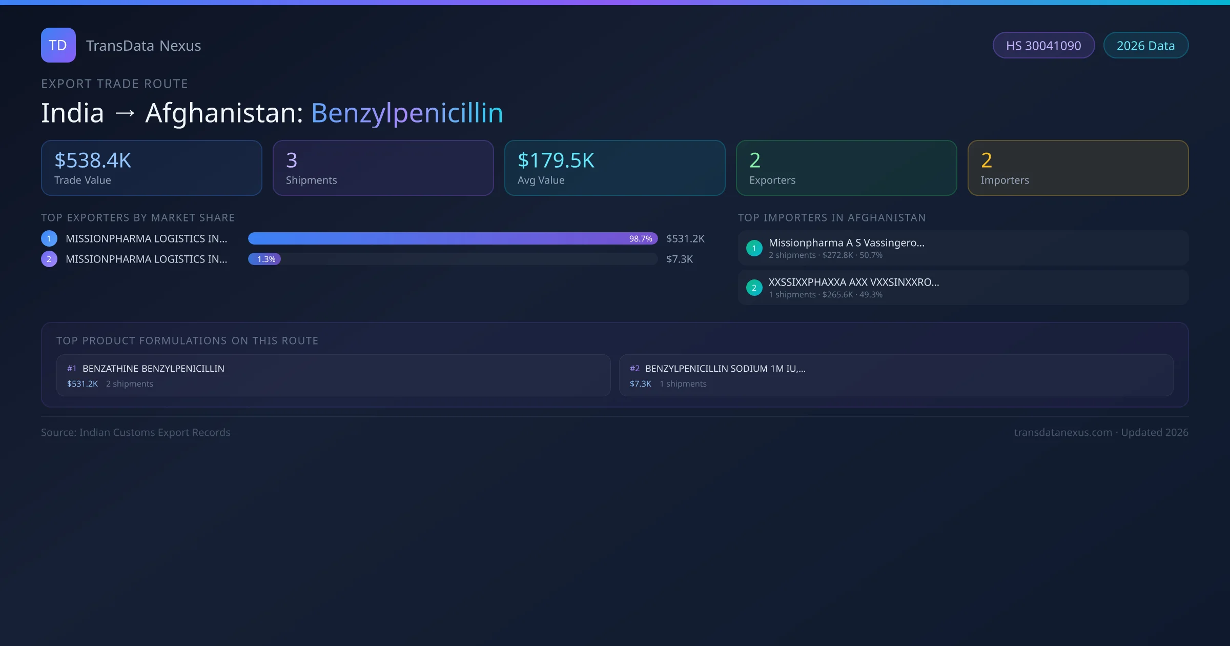 The India to Afghanistan Benzylpenicillin corridor is one of India's established pharmaceutical export routes, with 3 shipments documented worth a combined $538.4K USD. The route is dominated by MISSIONPHARMA LOGISTICS INDIA PRIVATE LIMITED, which alone accounts for roughly 99% of all export value, reflecting the consolidated nature of India's benzylpenicillin manufacturing sector.